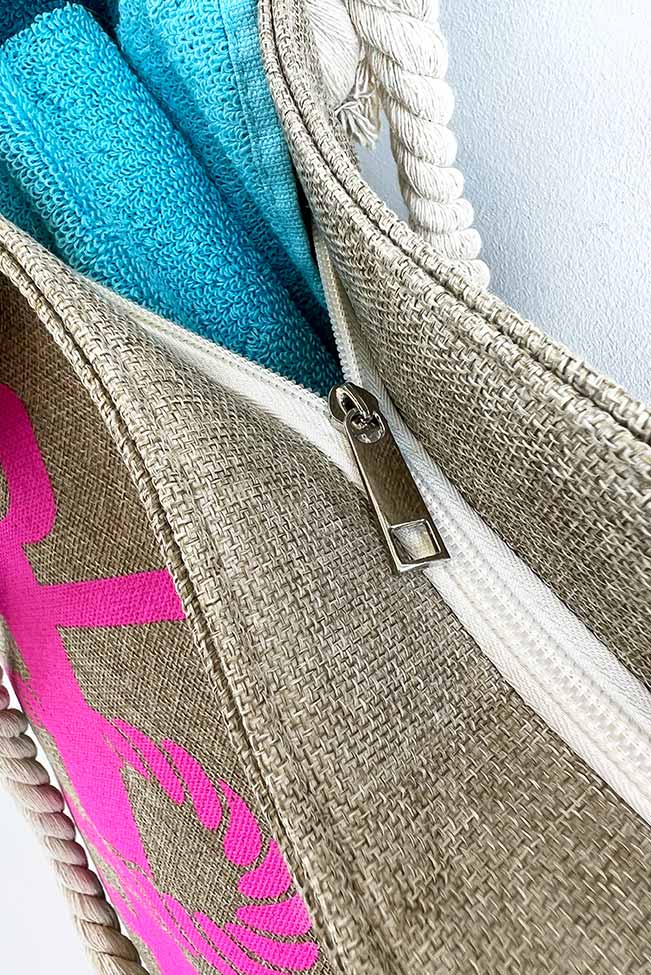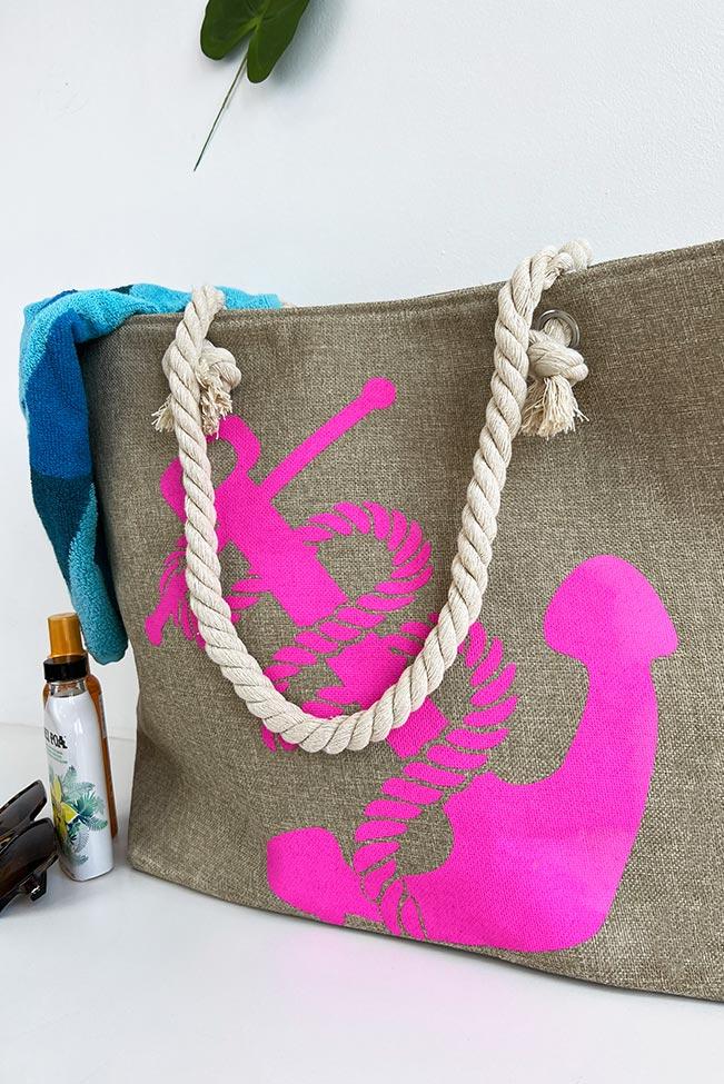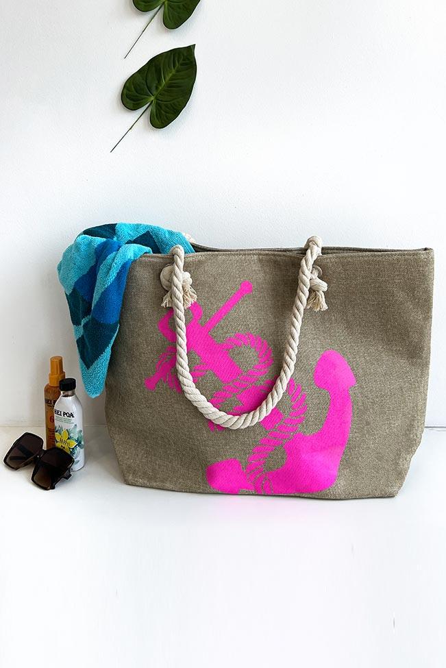 Γυναικεία τσάντα παραλίας σε all-day χακί χρώμα με ύφανση από λινάτσα και λουράκια ώμου από σχοινί. Διαθέτει φερμουάρ στο επάνω μέρος και μεγάλη ενιαία τσέπη εσωτερικά. Τύπωμα anchor στο μπροστινό μέρος σε ιδιαίτερο φούξια χρώμα.