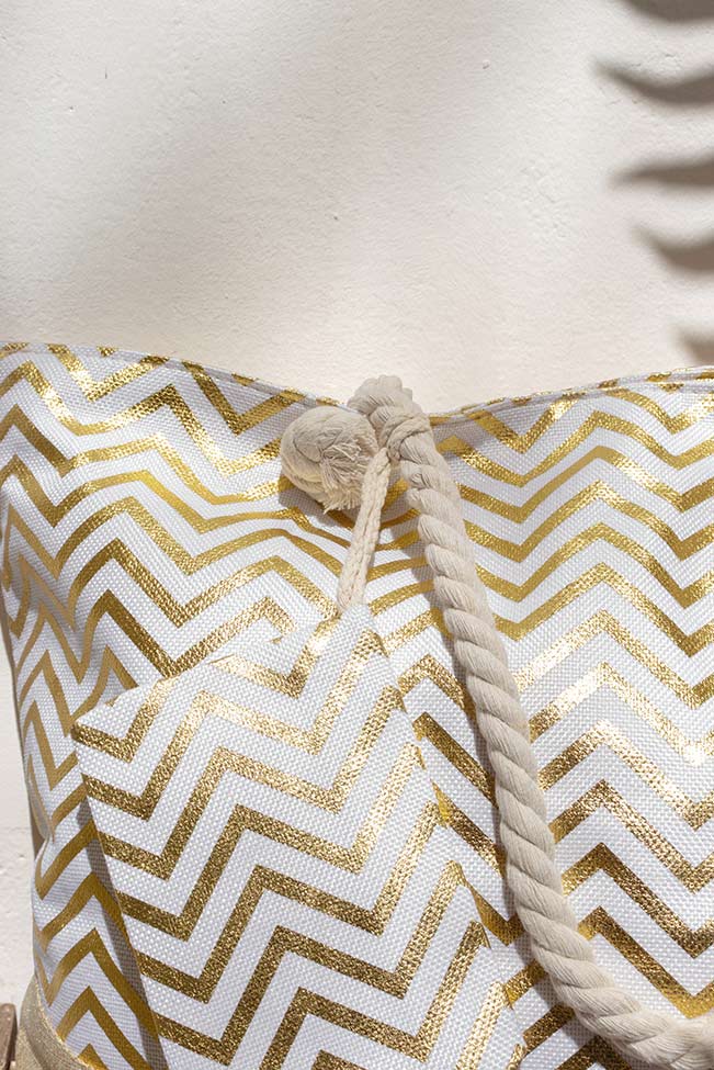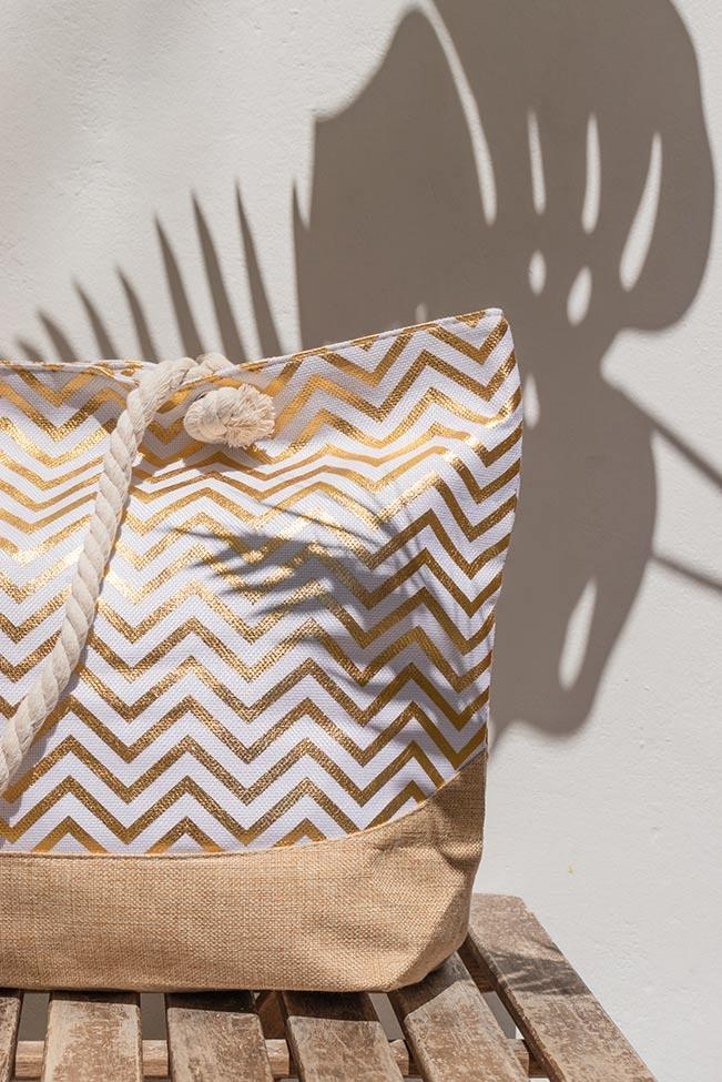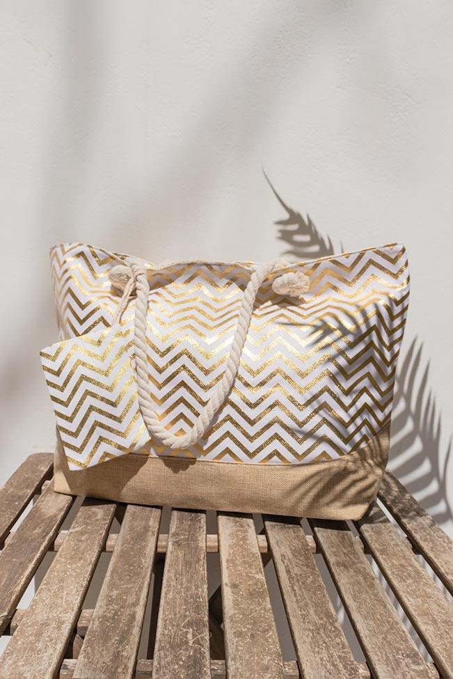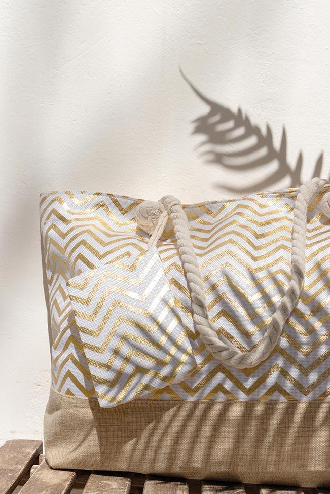Beach tote αδιάβροχη τσάντα σε μπεζ απόχρωση με χρυσές λεπτομέρειες. Διαθέτει φερμουάρ, εσωτερικά τσεπάκια και ένα έξτρα μικρό πορτοφολάκι.