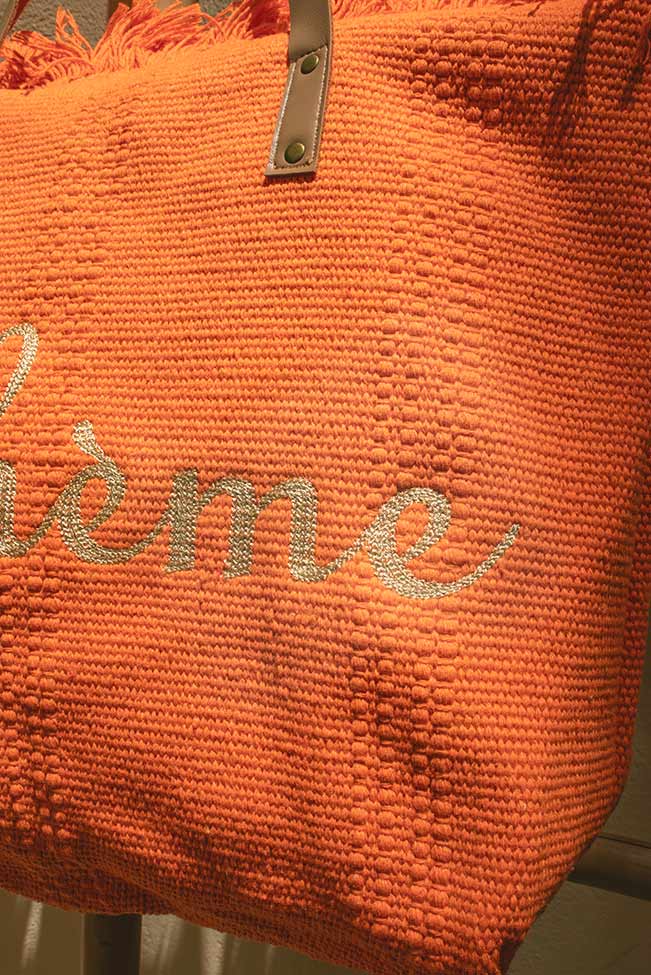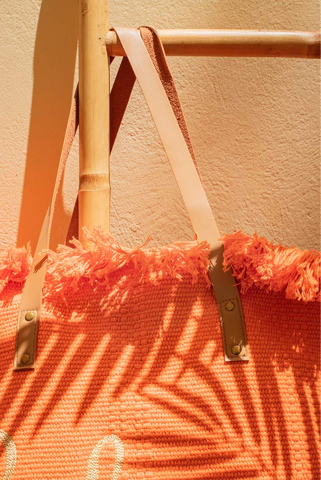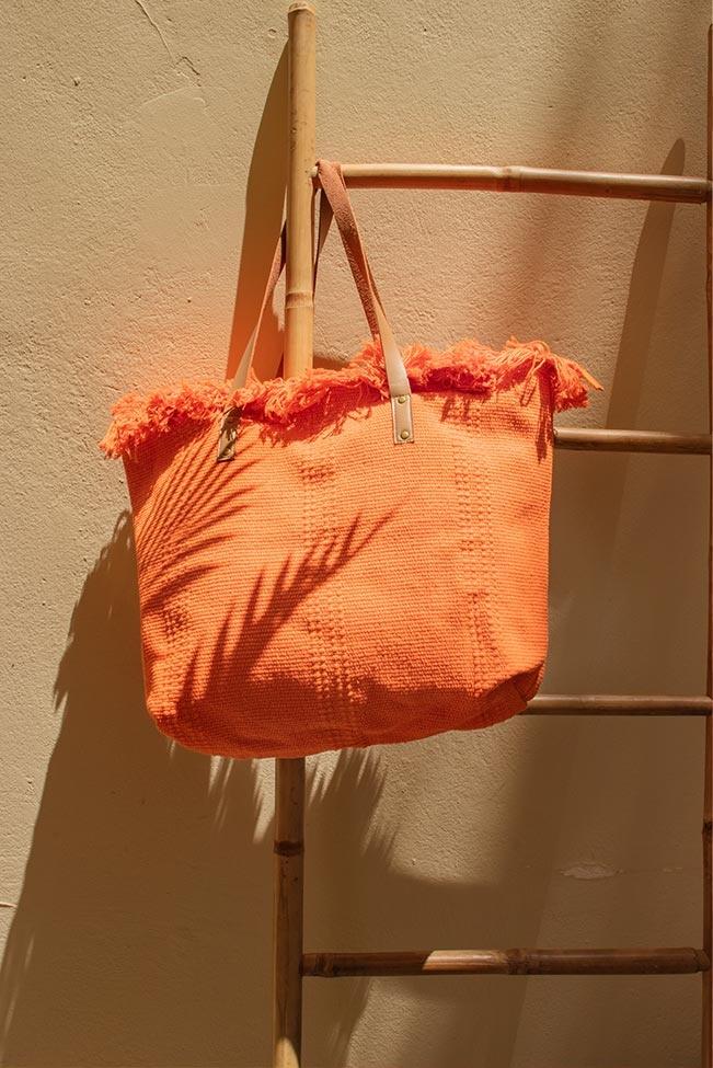 Τσάντα θαλάσσης υφασμάτινη πορτοκαλί με ξέφτια και print logo boheme. Διαθέτει λουράκι από δερματίνη και κλείνει με κουμπί. Στο εσωτερικό, η τσάντα θαλάσσης έχει μια μεγάλη ενιαία τσέπη.