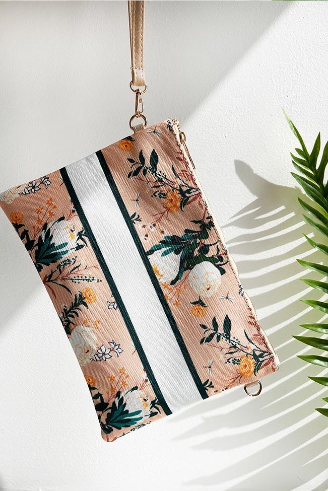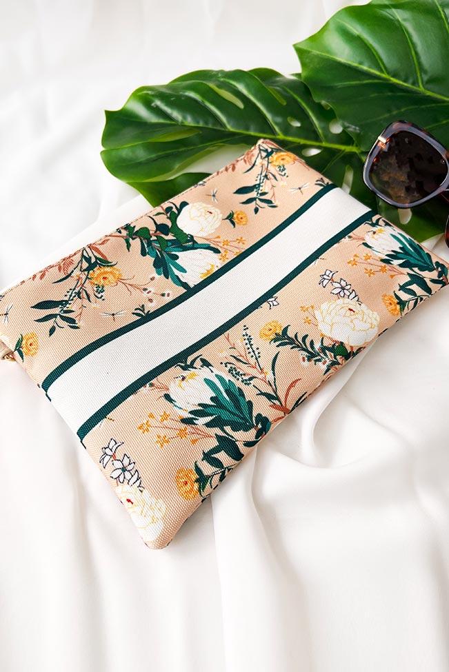 Τσαντάκι νεσεσέρ παραλίας σε μπεζ φλοράλ χρώμα με φαρδιά ρίγα και φλοράλ μοτίβο. Διαθέτει λουράκι χειρός και συνοδεύεται από επιπλέον μακρύ λουράκι που αφαιρείται. Στο εσωτερικό έχει μία ενιαία τσέπη καθώς και ένα μικρότερο τσεπάκι που κλείνει με φερμουάρ.
