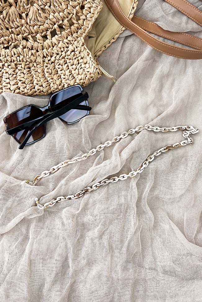 Explore grandma’s closet! Οι αλυσίδες είναι τα νέα must-have αξεσουάρ. Τύπου κοκκάλινη αλυσίδα για γυαλιά ηλίου από ακρυλικό υλικό. Με χοντρούς κρίκους σε μπεζ χρώμα και χρωματικό εφέ ταρταρούγα.