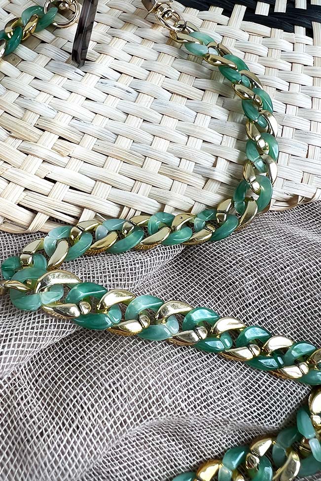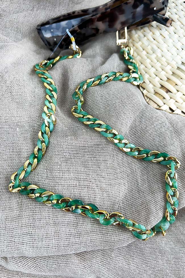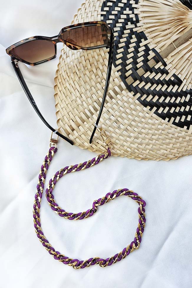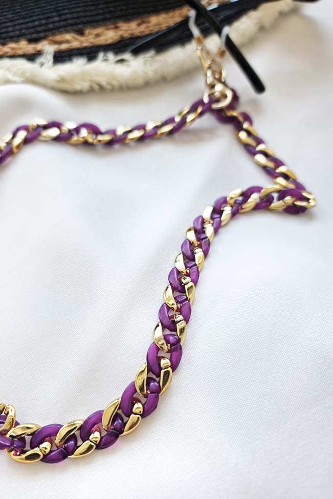 Οι “granny glasses chains” είναι τα νέα must-have αξεσουάρ. Αλυσίδα γυαλιών από ακρυλικό υλικό με χοντρούς κρίκους σε δύο χρωματικούς συνδυασμούς για να επιλέξετε: Μωβ-χρυσό και πράσινο-χρυσό.