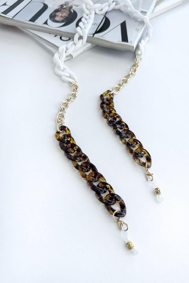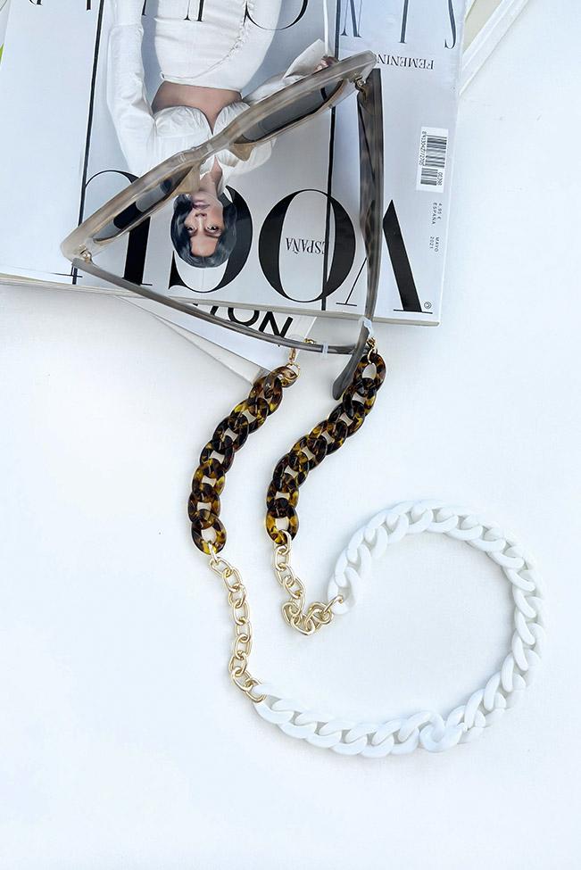 Οι αλυσίδες γυαλιών είναι τα νέα must-have αξεσουάρ. Elegant αλυσίδα γυαλιών τύπου κοκκάλινη αλυσίδα που συνδυάζει ακρυλικούς κρίκους σε λευκό & ταρταρούγα με μεταλλικούς μέρη σε χρυσό χρώμα.