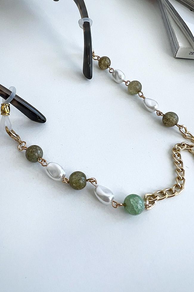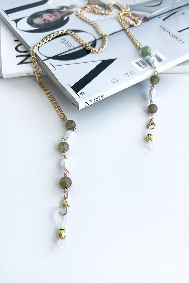 Οι sunglasses αλυσίδες είναι τα νέα must-have αξεσουάρ. Vintage style και ταυτόχρονα classy, μία glasses chain σε χρυσό με χάντρες σε στυλ πράσινου αχάτη και φεγγαρόπετρας. Στα άκρα διαθέτει κρικάκια σιλικόνης που ενώνονται με παπαγαλάκια στο κυρίως μέρος της.