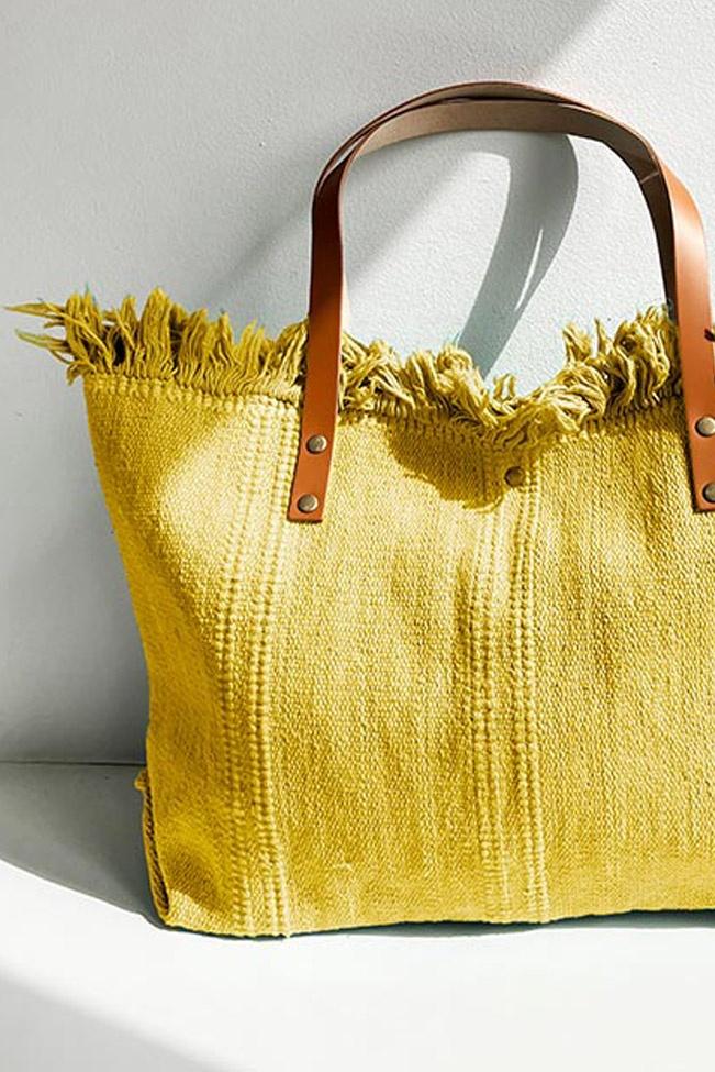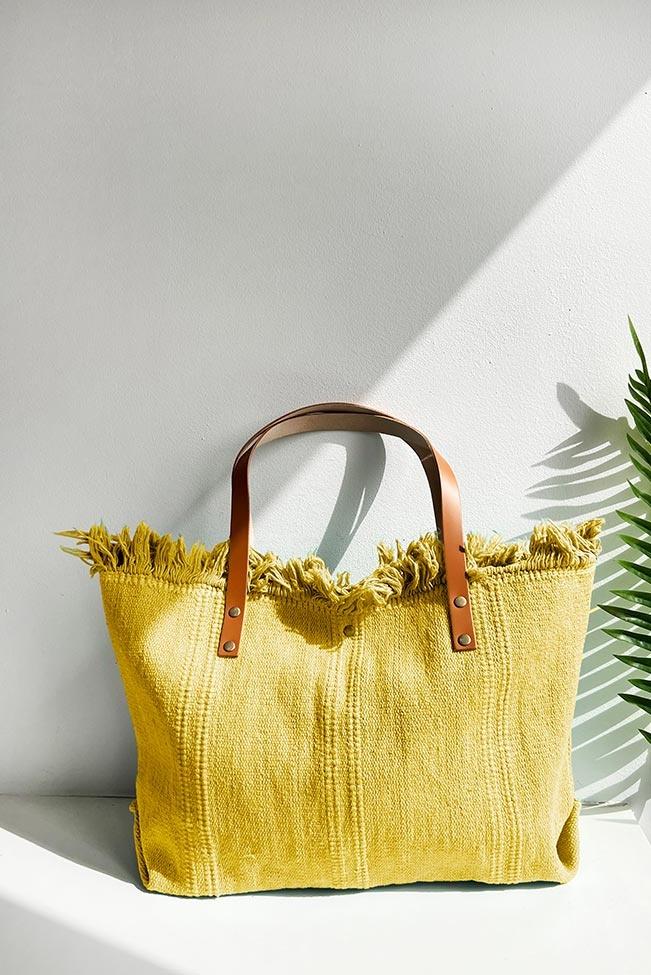 Tote τσάντα θαλάσσης σε κίτρινο summer απόχρωση. Διαθέτει λουράκι από δερματίνη και κλείνει με κουμπί. Στο εσωτερικό, η τσάντα θαλάσσης έχει μια μεγάλη ενιαία τσέπη.