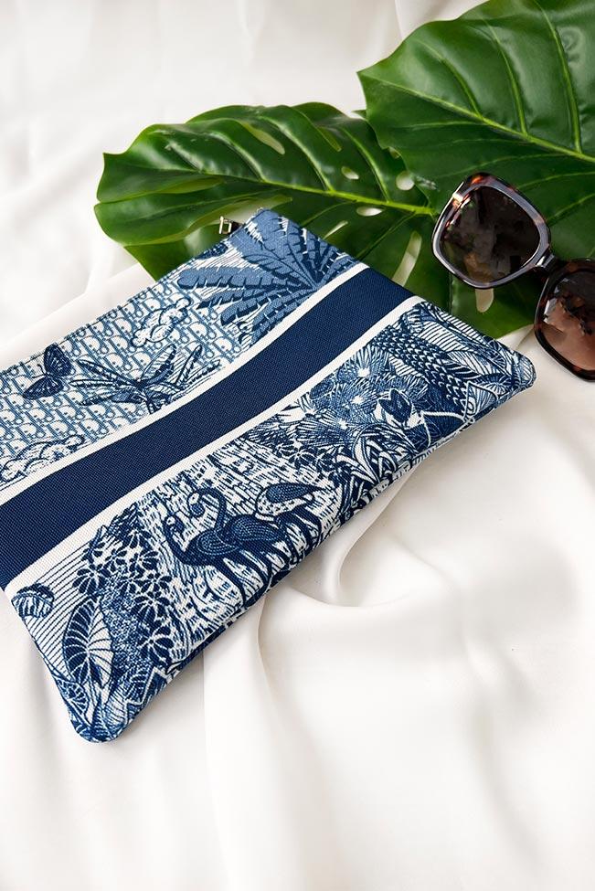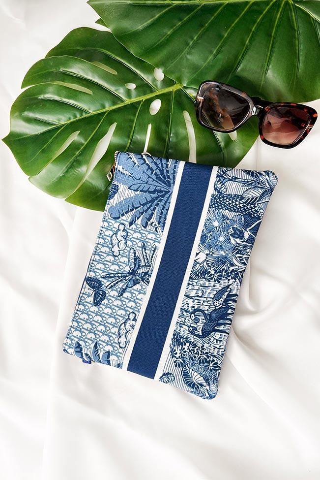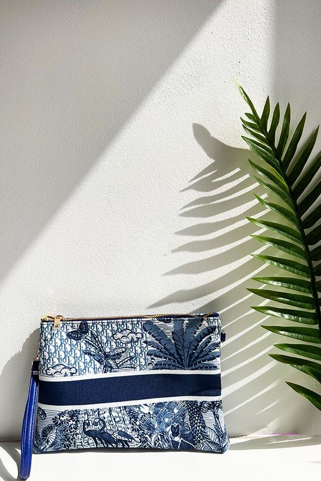 Τσαντάκι νεσεσέρ θαλάσσης σε μπλε χρώμα με φαρδιά ρίγα και τροπικό μοτίβο. Διαθέτει λουράκι χειρός και συνοδεύεται από επιπλέον μακρύ λουράκι που αφαιρείται. Στο εσωτερικό έχει μία ενιαία τσέπη καθώς και ένα μικρότερο τσεπάκι που κλείνει με φερμουάρ.