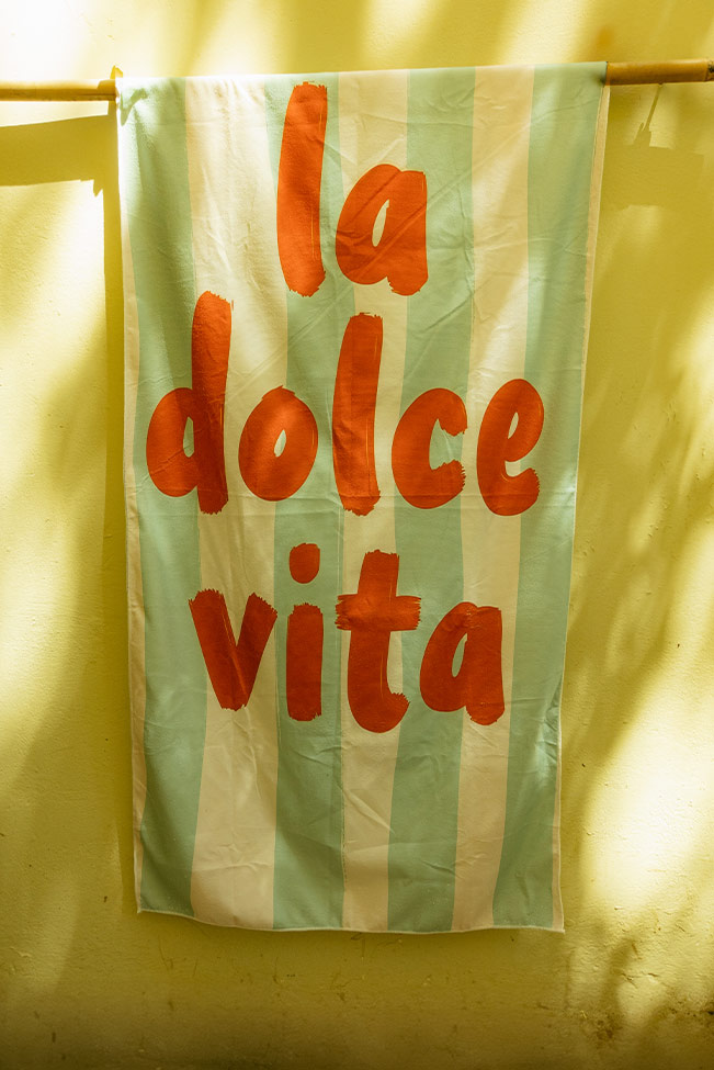 Η απόλυτη πετσέτα για το καλοκαίρι είναι εδώ – και φωνάζει La Dolce Vita! Με ρετρό ρίγες σε παστέλ αποχρώσεις και bold πορτοκαλί lettering, αυτή η γυναικεία πετσέτα θαλάσσης δεν είναι απλώς πρακτική… είναι fashion statement. Το playful design της φέρνει vibes από ιταλική ριβιέρα — ιδανικό για stylish beach looks. Ρίξε την πάνω σε ξαπλώστρα, τύλιξέ την σαν φουλάρι ή βάλε τη μέσα στην ψάθινη τσάντα σου για extra χρώμα και attitude!