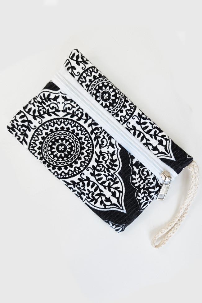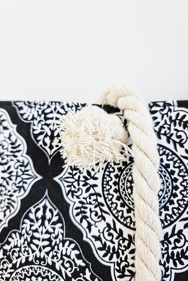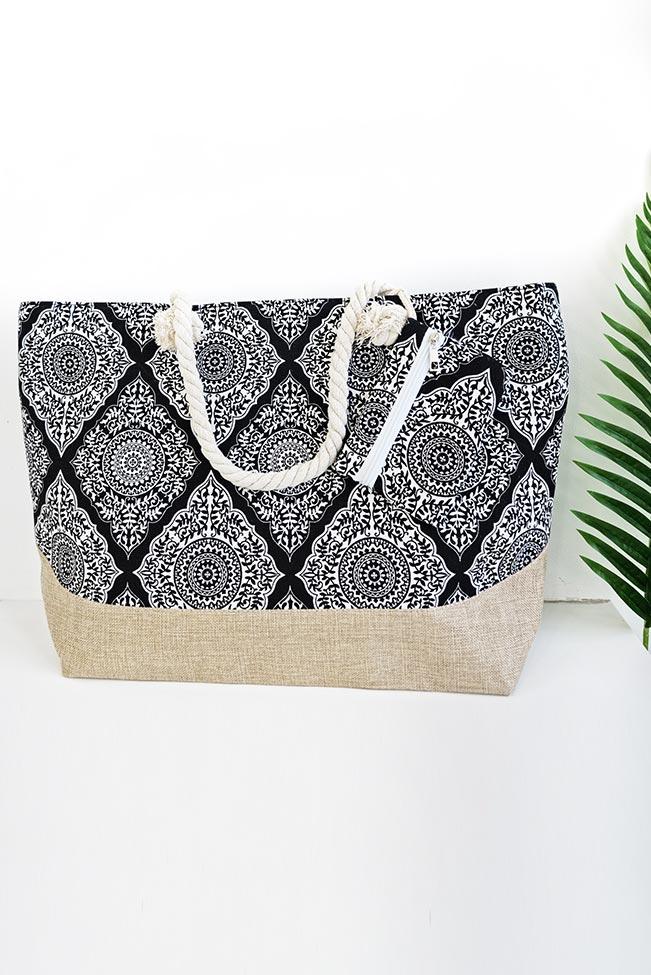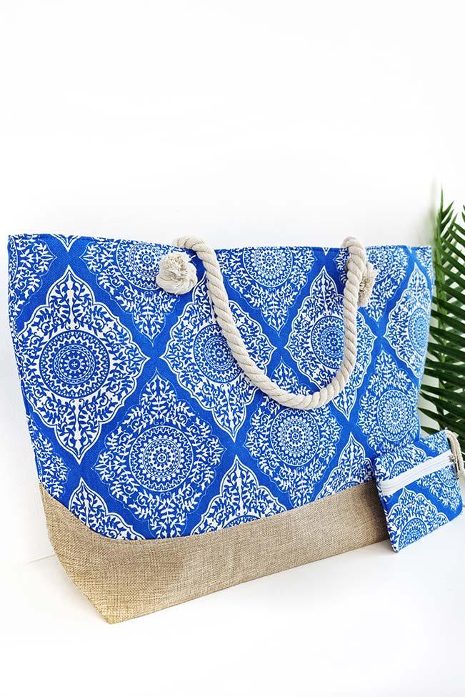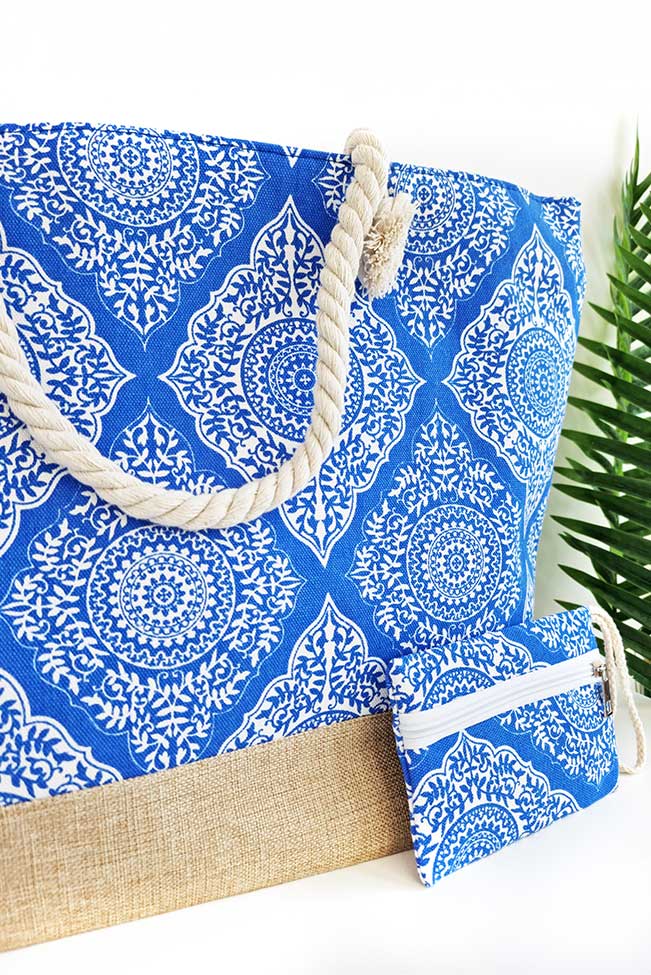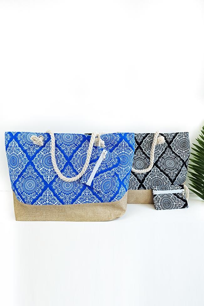Tote bag πανινη με mandala pattern σε δύο αποχρώσεις για να επιλέξετε: Μαύρο και μπλε ραφ. Μια μεγάλη τσάντα ώμου με λουριά από σχοινί, εσωτερική θήκη και κλείσιμο με φερμουάρ. Το τσαντάκι-πορτοφόλι που τη συνοδεύει είναι ίδιου χρώματος και κλείνει επίσης με φερμουάρ.