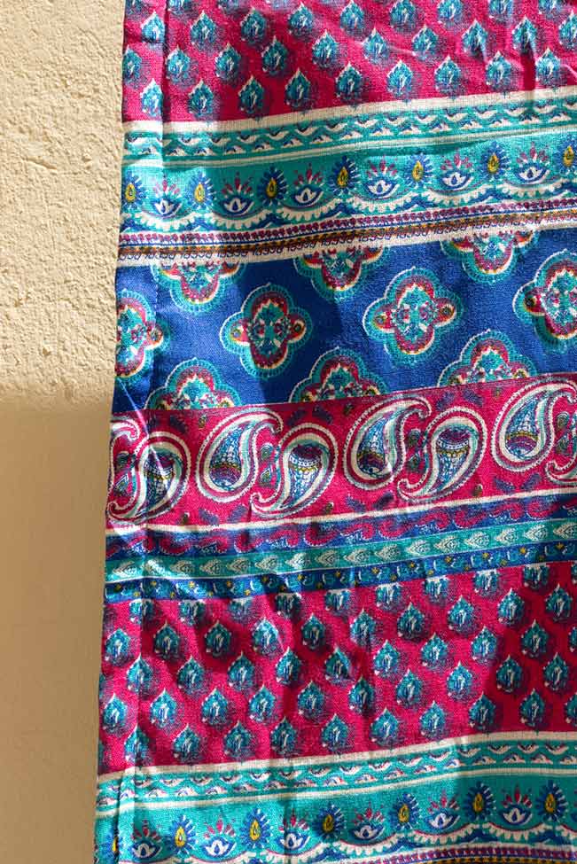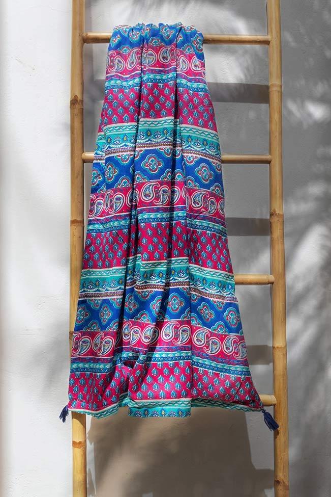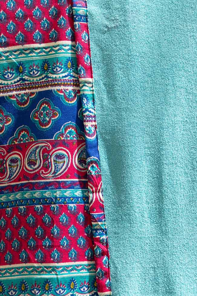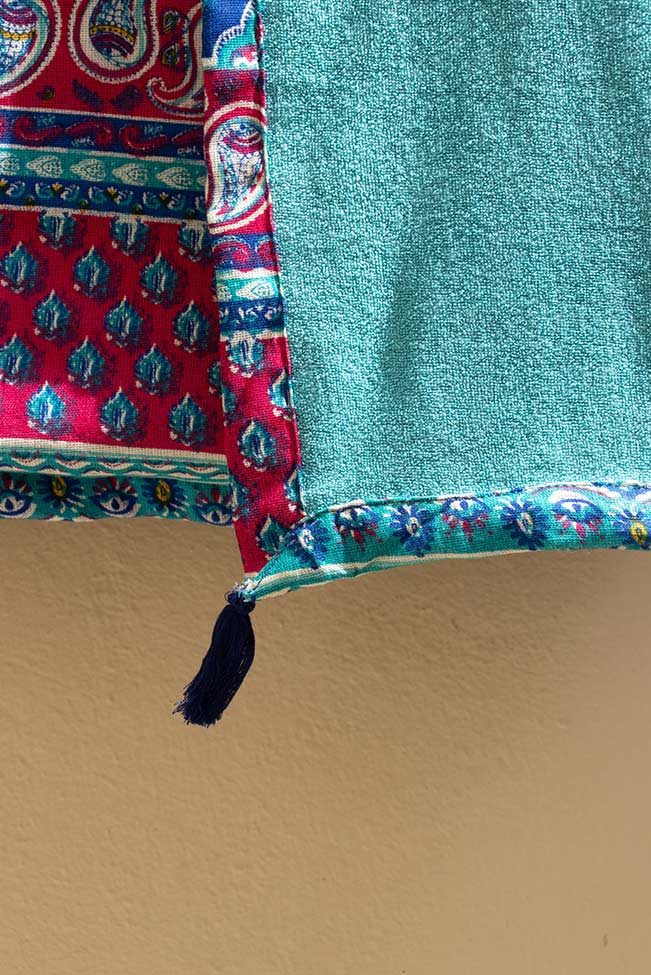 Πετσέτα παρεό θαλάσσης πολύχρωμη με διάφορα ethnic σχέδια. Είναι διπλής όψης με γαλάζια απορροφητική επένδυση στη μία πλευρά και διάφορα ethnic σχέδια στην άλλη. Στις άκρες της έχει μικρά διακοσμητικά φουντάκια.