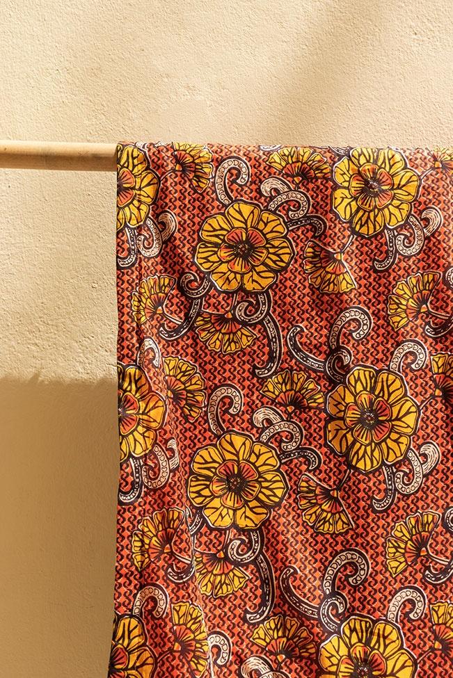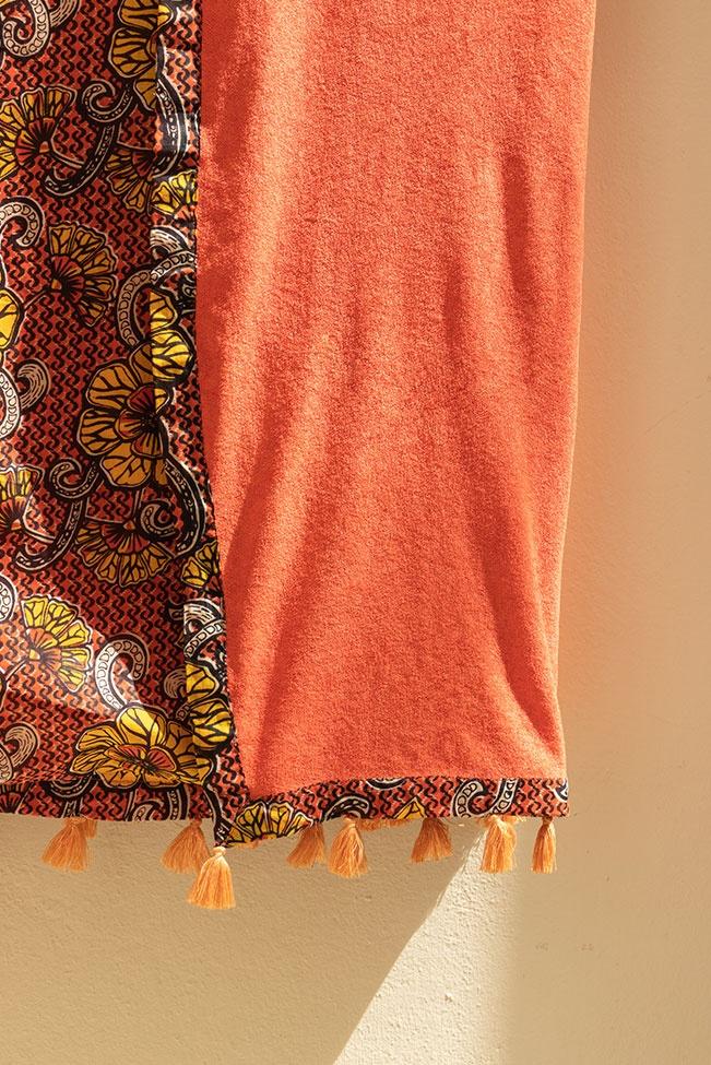 Πετσέτα παρεό θαλάσσης διπλής όψης σε πορτοκαλί απόχρωση με ιδιαίτερο floral μοτίβο και playful διακοσμητικά φουντάκια στις άκρες.