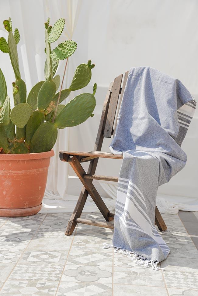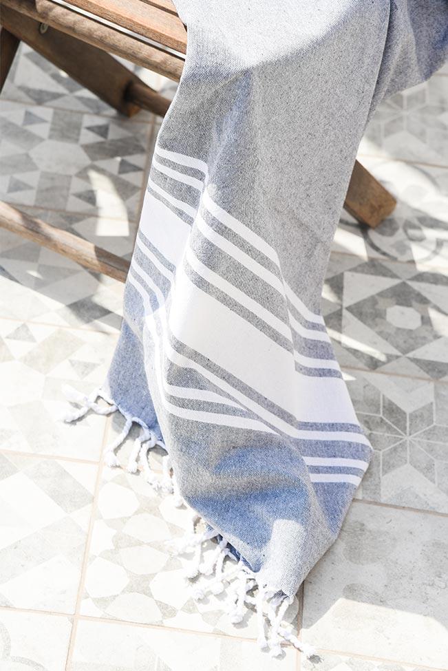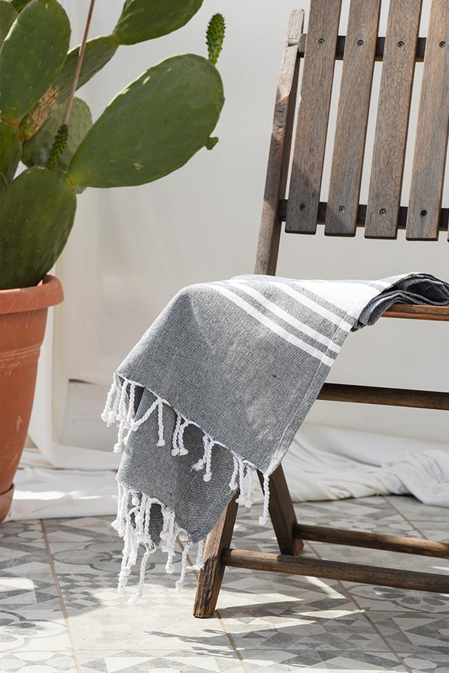 Βαμβακερή γκρι πετσέτα θαλάσσης – πεστεμάλι που φοριέται και σαν παρεό όλες τις ώρες της ημέρας.
