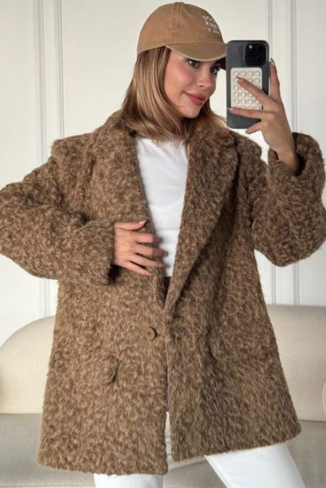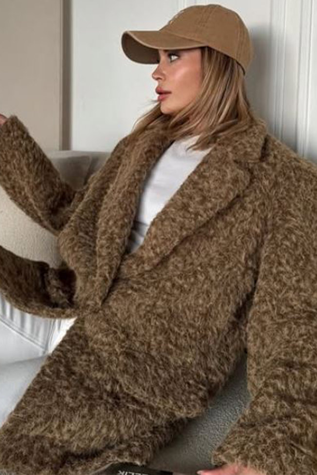 Oversized καφέ fur σακάκι με τσέπες και κουμπιά. Είναι άνετο και ιδανικό για κάθε περίσταση.