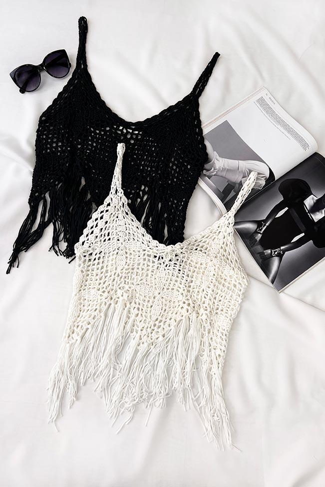 Hippie style crochet τοπ με κρόσσια στο τελείωμα και ανοιχτή, διάτρητη πλέξη σε μαύρο χρώμα.