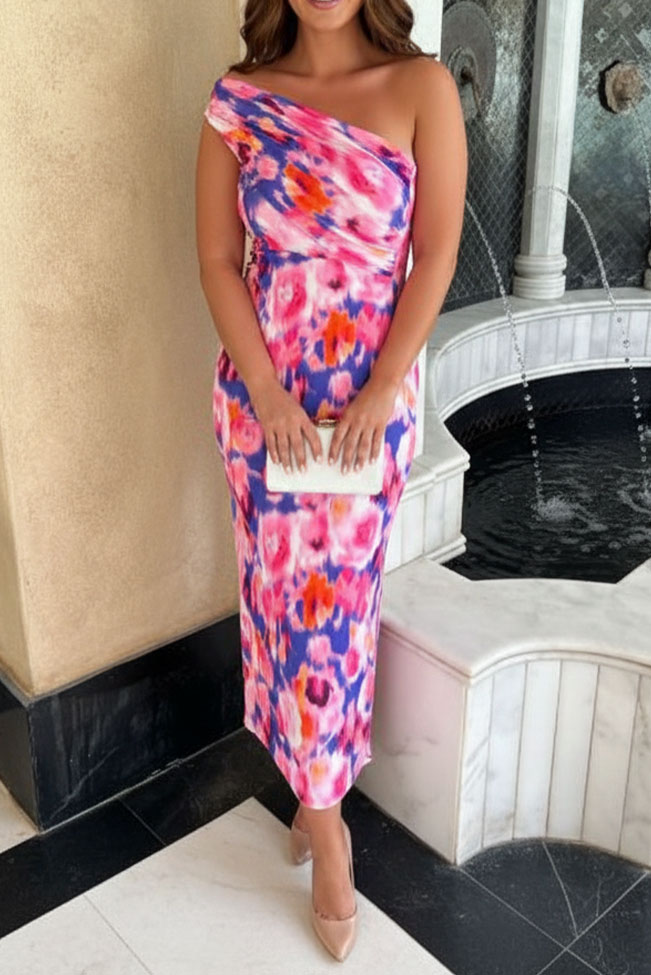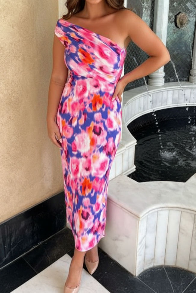 Γυναικείο μακρύ φόρεμα πολύχρωμο με abstract σχέδια και έναν ώμο. Διατίθεται σε onesize και καλύπτει έως medium.