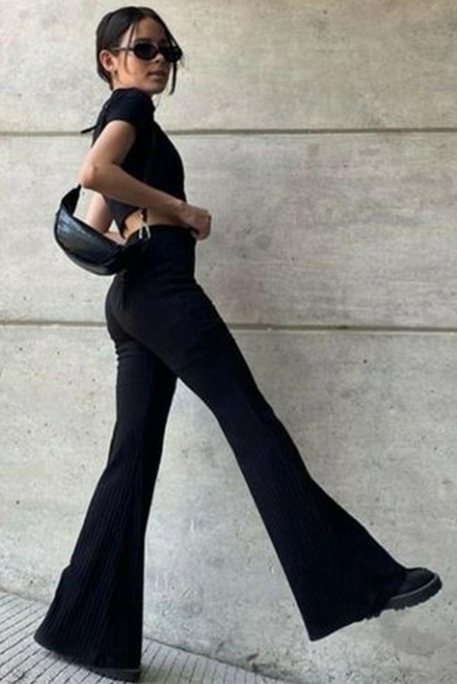 Vintage κοτλέ ψηλόμεση παντελόνα σε βελούτε ύφανση, σε μαύρη απόχρωση με μαλακή υφή, κάθετες γραμμές και καμπάνα τελείωμα.