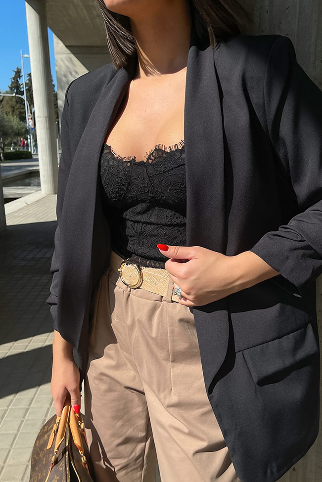 Φορετό μαύρο ελαστικό μπουστάκι με ρυθμιζόμενες τιράντες, μικρή ενίσχυση και λεπτομέρειες από δαντέλα. Είναι Onesize το νουμεράκι του και καλύπτει S και M.