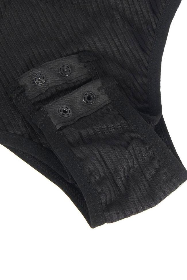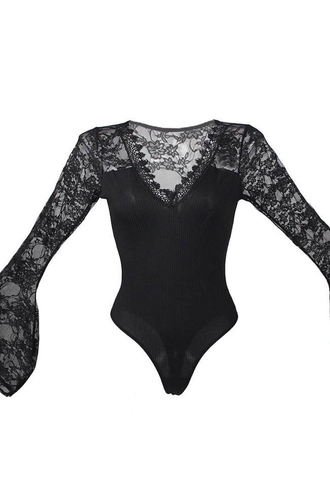 Boho lacey μακρυμάνικο κορμάκι σε μαύρο χρώμα με rib ύφασμα και ημιδιάφανα μανίκια καμπάνα από δαντέλα.