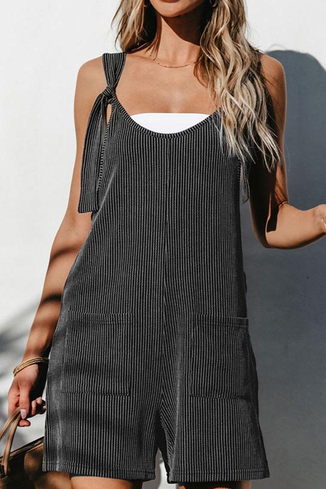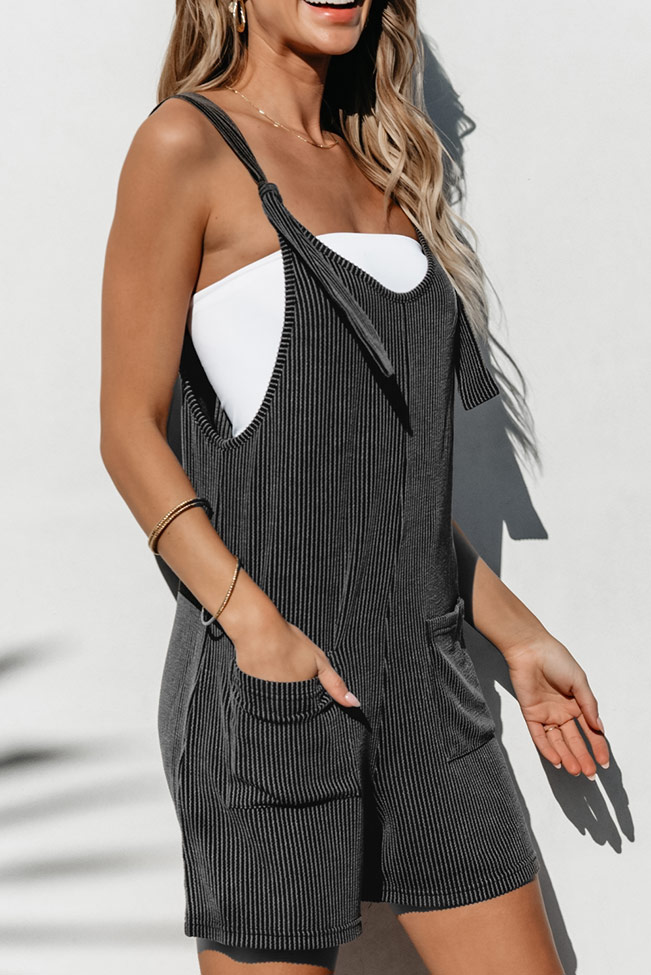 Άνετο rib ολόσωμο σορτσάκι σαλοπέτα σε άνετη γραμμή με τιράντες που δένονται και τσέπες. Τέλειο για casual chic ανοιξιάτικες εμφανίσεις.