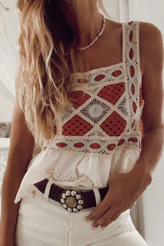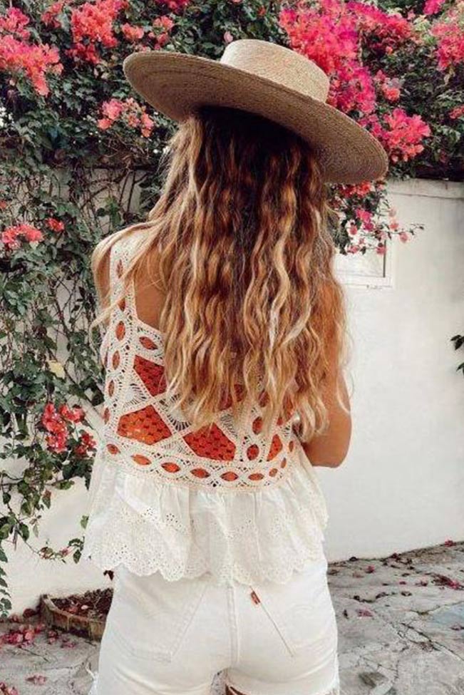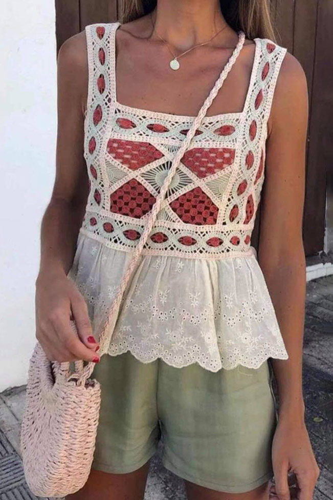 Boho αμάνικο crochet top πολύχρωμο με κέντημα και ρομαντικό τελείωμα. Άνετο και στιλάτο, ταίριαξε το με τζιν, ή σορτς για να απογειώσεις το hippie look σου.
