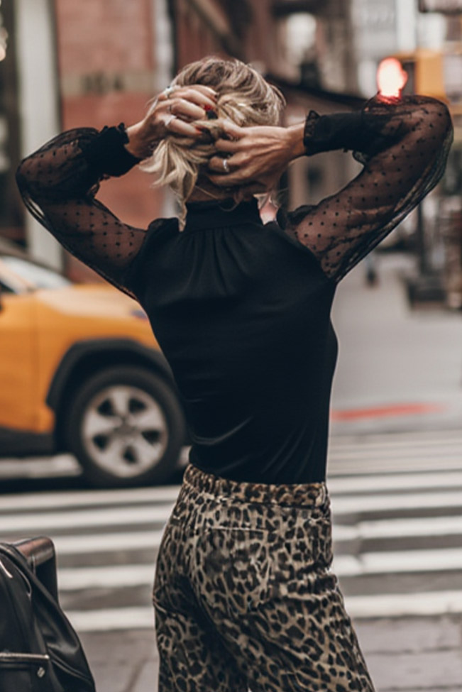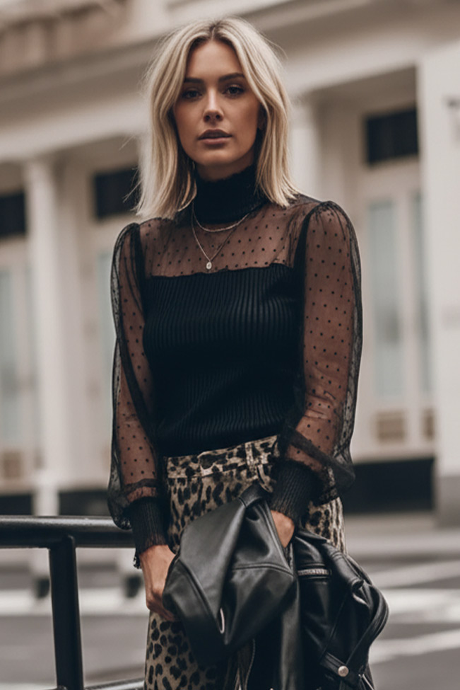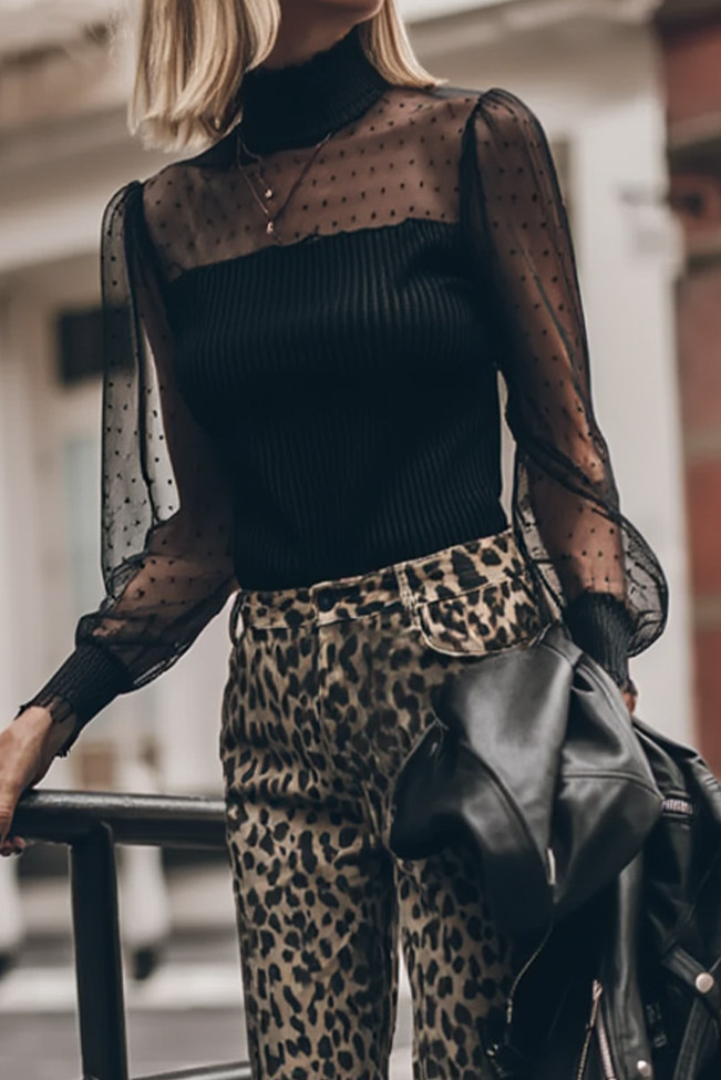 Επιπλέον, η εφαρμογή του αναδεικνύει τη σιλουέτα με διακριτικό τρόπο, ενώ ο ψηλός λαιμός προσφέρει αέρα πολυτέλειας και φινέτσας. Τα μακριά μανίκια από τούλι και οι ρομαντικές λεπτομέρειες στο τελείωμα κάνουν το διαφανές μαύρο πουά κορμάκι ένα statement κομμάτι που μπορεί να φορεθεί με πολλούς τρόπους.
