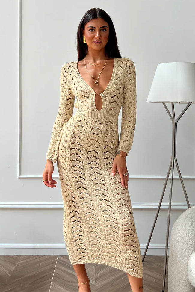 Το χρυσό πλεκτό φόρεμα με άνοιγμα είναι η απόλυτη επιλογή για εμφανίσεις που αποπνέουν πολυτέλεια και θηλυκότητα. Η see-through πλέξη του προσθέτει αέρινη υφή, ενώ η εντυπωσιακή λαιμόκοψη με άνοιγμα στο μπούστο και διακοσμητικά κουμπιά ενισχύει το sexiness του look με έναν εκλεπτυσμένο τρόπο.