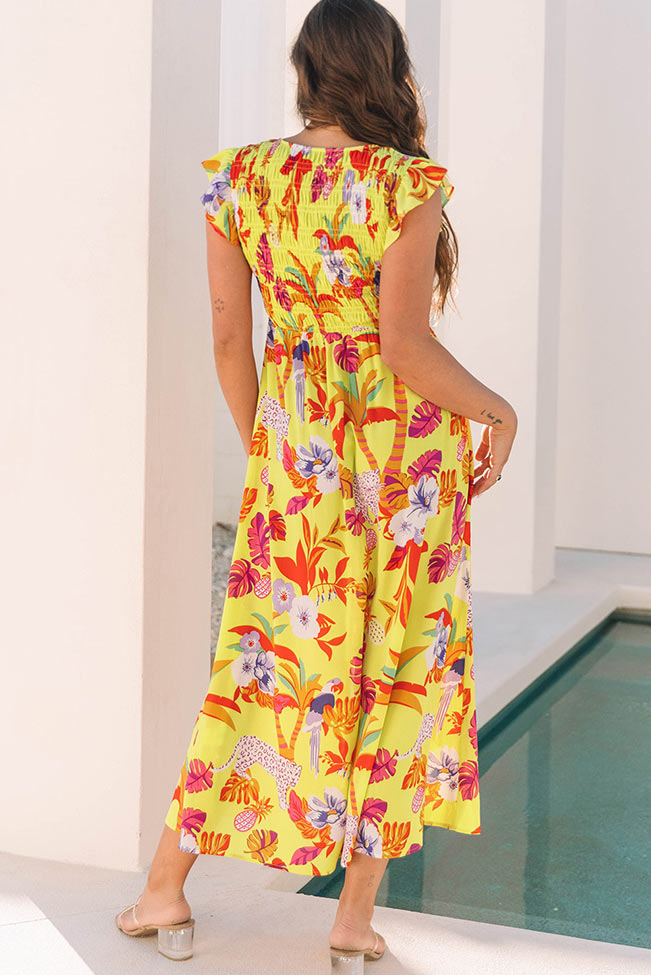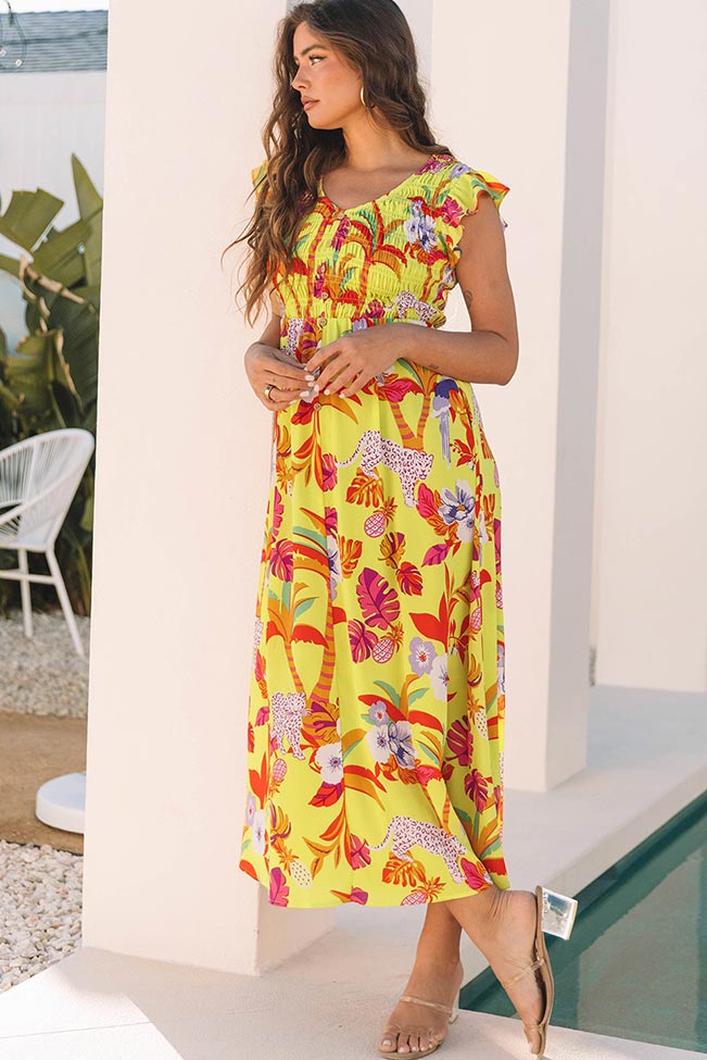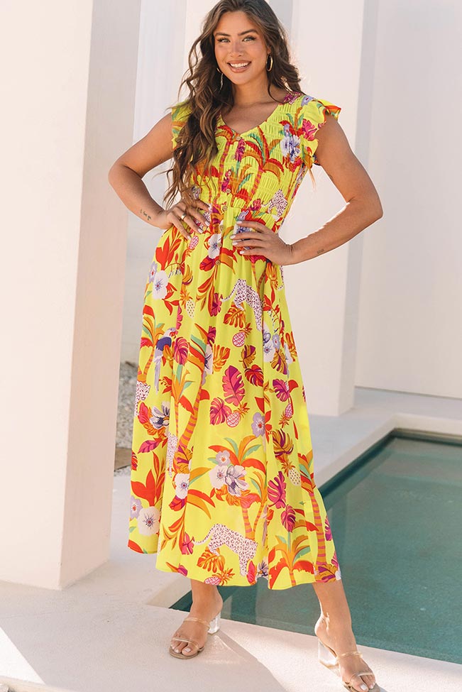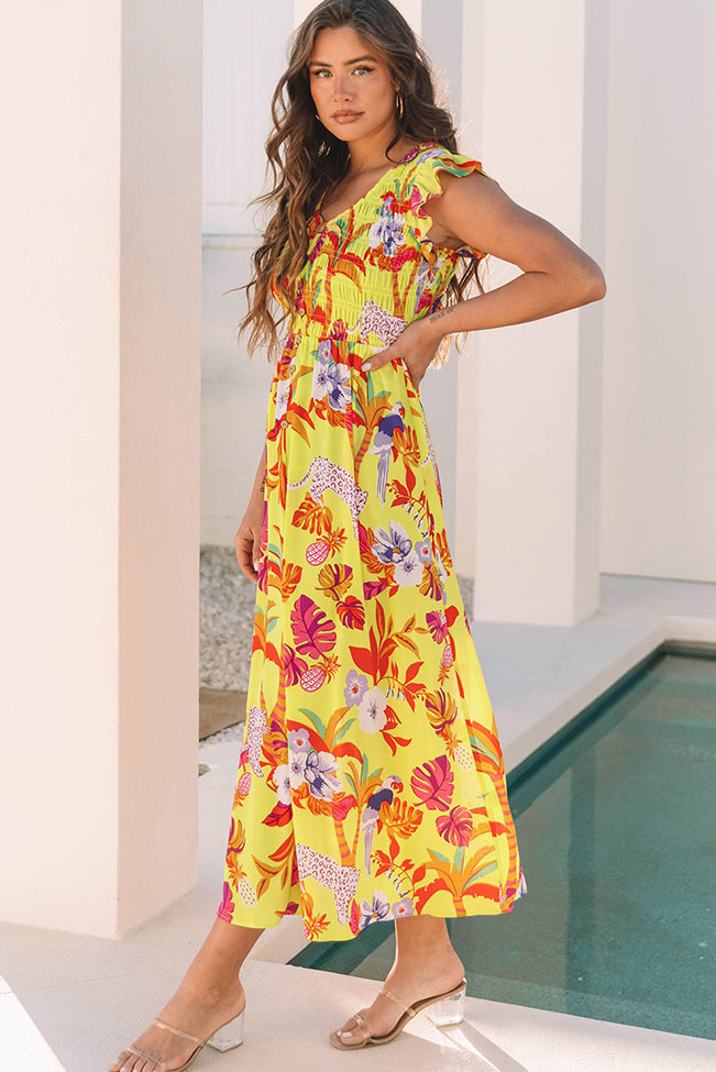 Καλοκαίρι χωρίς χρώμα γίνεται; Όχι βέβαια! Αυτό το μάξι φόρεμα σε έντονη κίτρινη βάση με τροπικά λουλούδια, λεοπαρδάλεις και παπαγάλους είναι το απόλυτο vacation mood σε ρούχο! Το smok μπούστο αγκαλιάζει το σώμα με άνεση, ενώ τα βολάν στα μανίκια προσθέτουν μια δροσερή, ρομαντική πινελιά. Το ύφασμα είναι ελαφρύ, αέρινο και ιδανικό για τις ζεστές μέρες της πόλης ή του νησιού.