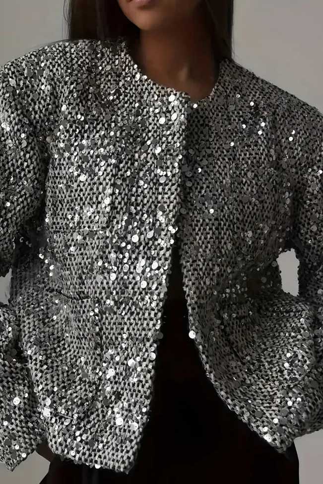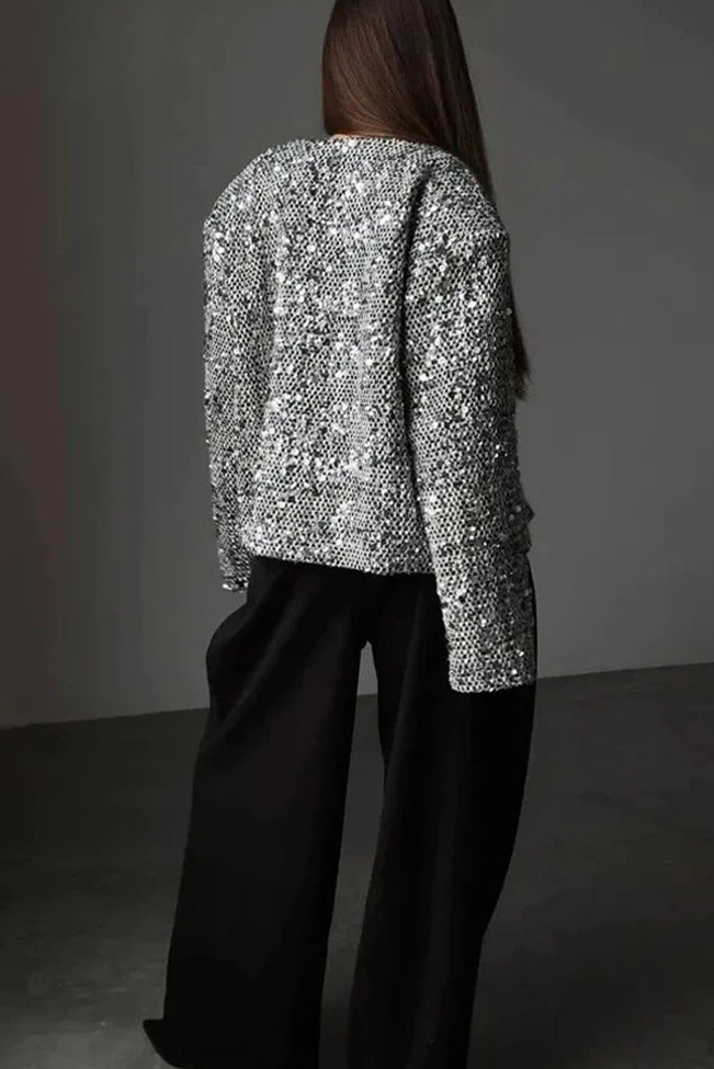 Το γυναικείο σακάκι με παγιέτες είναι το κομμάτι που δίνει αμέσως λάμψη σε κάθε εμφάνιση. Η πλεκτή υφή του δημιουργεί ένα εντυπωσιακό παιχνίδι φωτός, ενώ η ασημί παλέτα προσθέτει μοντέρνο χαρακτήρα. Επιπλέον, η χαλαρή γραμμή του κάνει το styling εύκολο και άνετο, ακόμη και για πολλές ώρες.