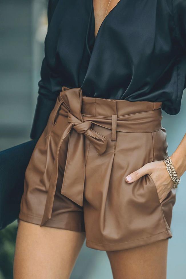 Ψηλόμεσο δερμάτινο κάμελ σορτσάκι με ζωνάκι ίδιου υφάσματος και τσέπες. Βγαίνει σε νουμεράκι απο small μέχρι large και έχει άνετη κανονική γραμμή.