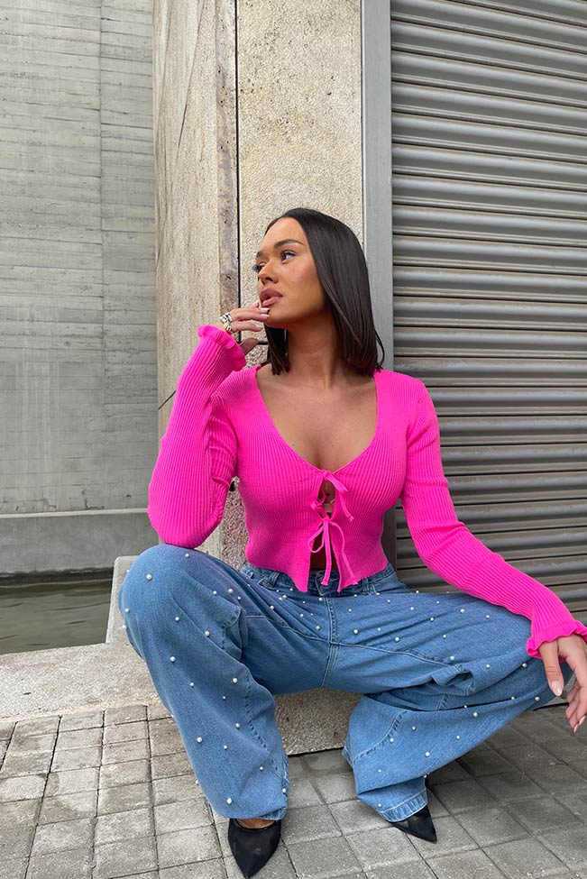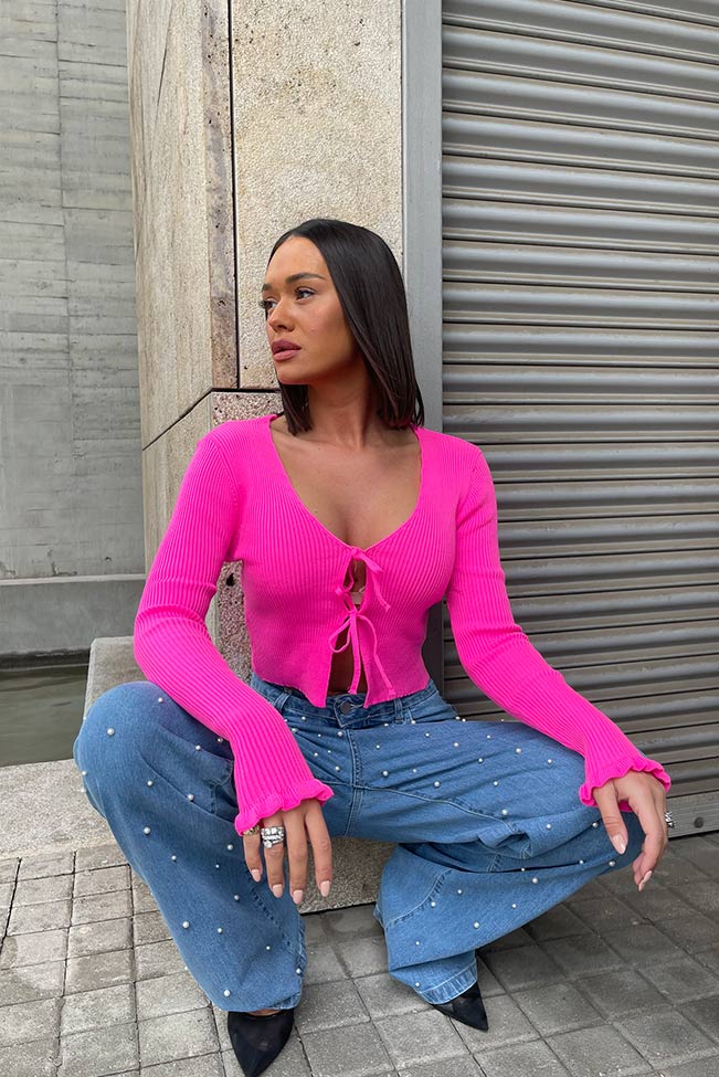 Ζακετάκι rib με δετά κορδόνια φουξία