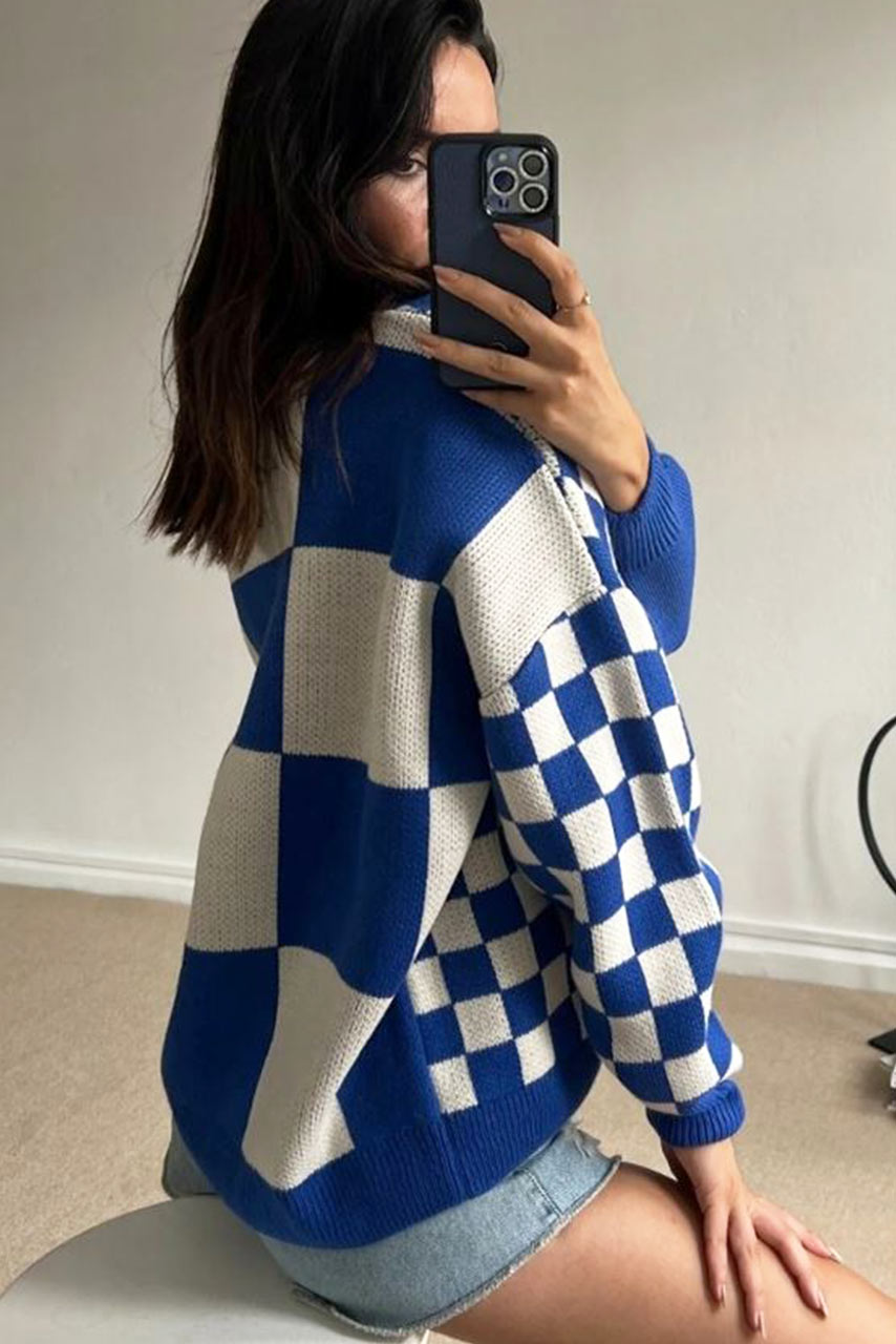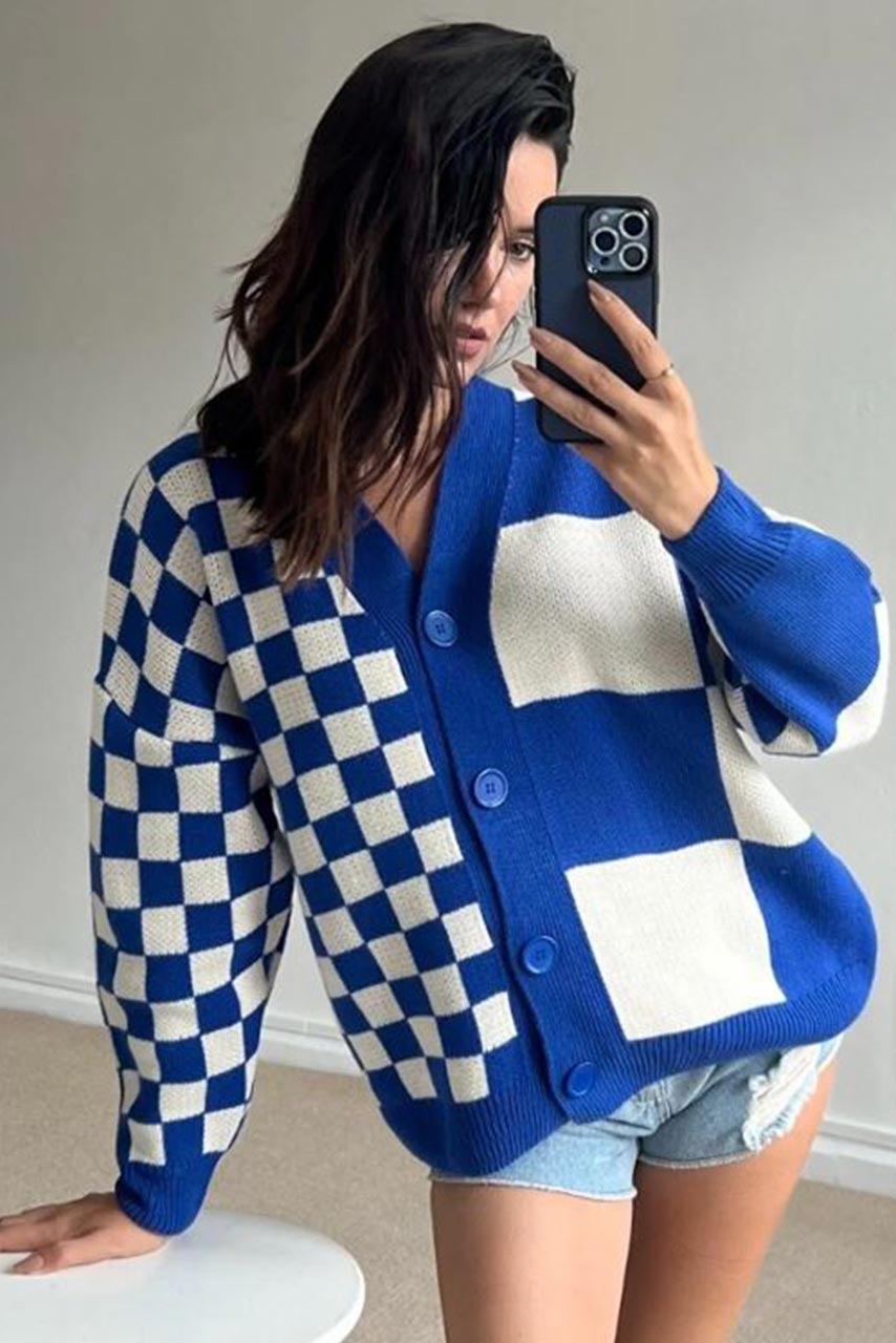Trendy ζακέτα σκακιέρα διαθέσιμη σε μπλε χρώμα. Μια ιδιαίτερη ζεστή ζακέτα που θα τραβήξει τα βλέμματα.