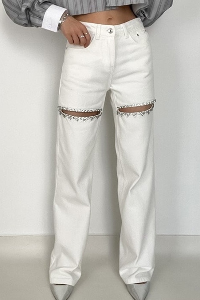Jean με σκίσιμο και διακοσμητικά strass λευκό