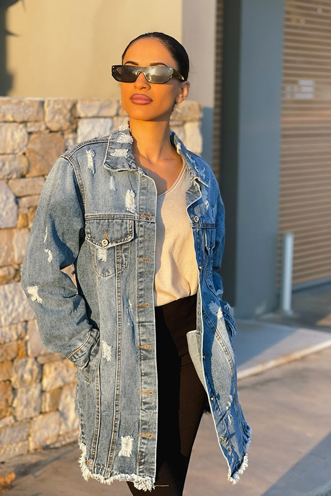 Must-have τζιν denim long jacket, τέλειο για το μακρύ πανωφόρι που χρειάζεσαι για το φθινόπωρο, σε κλασσικό μπλε με σκίσιματα, κουμπιά και μεγάλες τσέπες.