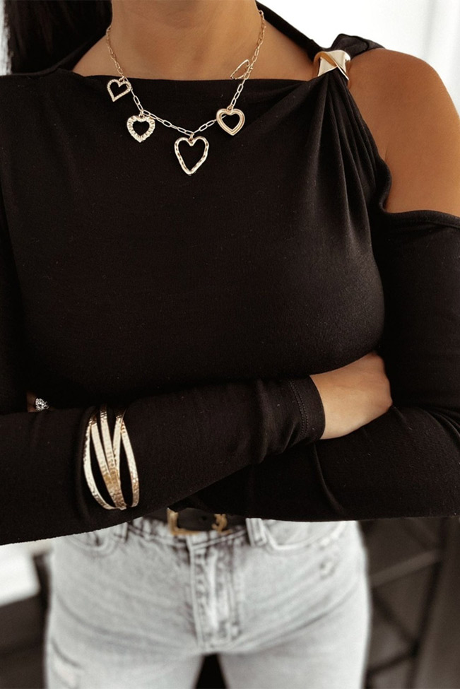 Η μαύρη ασύμμετρη μπλούζα με ανοιχτό ώμο είναι το κομμάτι που θα αναδείξει το προσωπικό σου στυλ με διακριτική θηλυκότητα. Το απαλά ελαστικό ύφασμα αγκαλιάζει το σώμα, προσφέροντας άνεση και τέλεια εφαρμογή σε κάθε κίνηση. Η χρυσή λεπτομέρεια στον ώμο προσθέτει έναν αέρα πολυτέλειας, μετατρέποντας ακόμη και το πιο απλό outfit σε fashion statement.