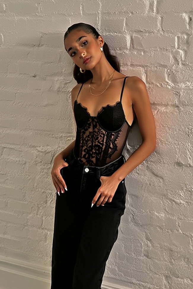 Το γυναικείο μαύρο δαντελένιο κορμάκι δίνει ένταση και κομψότητα σε κάθε look. Η διάφανη δαντέλα αγκαλιάζει το σώμα με φυσικό τρόπο και δημιουργεί μια sleek γραμμή που τονίζει τη μέση. Οι λεπτές τιράντες προσφέρουν σταθερότητα, ενώ το δομημένο μπούστο ενισχύει το σχήμα του στήθους χωρίς να βαραίνει το σύνολο.