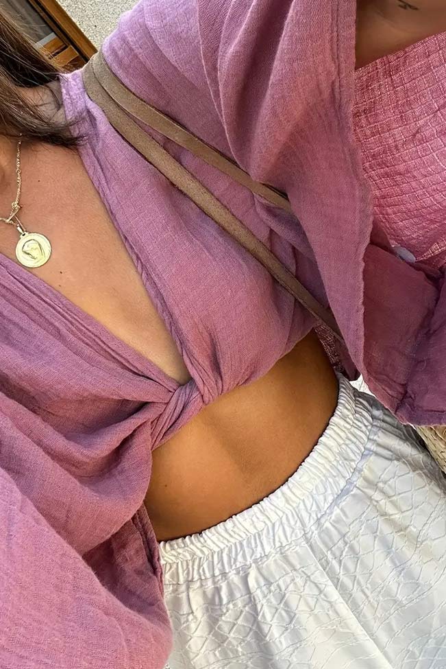 Η μπλούζα που αποπνέει ανεπιτήδευτο καλοκαιρινό στυλ είναι εδώ για να ανανεώσει την κάθε σου εμφάνιση! Με μωβ χρώμα που αναδεικνύει το μαύρισμα και κόμπο στο στήθος για έξτρα θηλυκότητα, αυτή η μπλούζα συνδυάζει χαλαρή εφαρμογή και boho αίσθηση. Το ελαφρύ ύφασμα τύπου λινό «αγκαλιάζει» το σώμα χωρίς να το βαραίνει, ενώ τα φαρδιά μανίκια προσδίδουν κίνηση και κομψότητα σε κάθε βήμα.