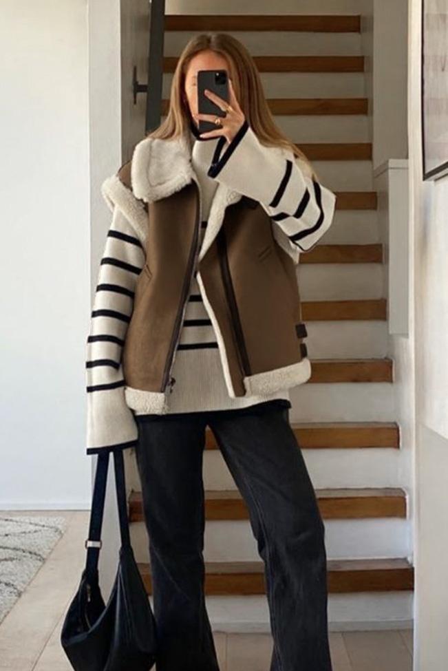 Γιλέκο oversized με επένδυση γούνας sherpa σε aviator στυλ και κάμελ απόχρωση, για casual ζεστές εμφανίσεις.