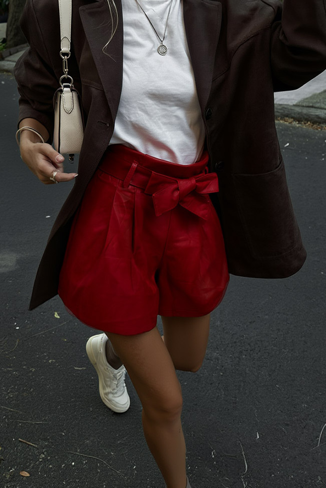 Παράλληλα, η κομψή ζώνη-φιόγκος ενισχύει τη θηλυκή πλευρά του design. Έτσι, το κόκκινο σορτσάκι δερματίνης λειτουργεί ως statement κομμάτι που μεταμορφώνει ακόμη και το πιο απλό basic σύνολο. Μπορείς να το συνδυάσεις με λευκό t-shirt για ένα καθαρό street-style mood. Ωστόσο, με ένα oversized blazer αποκτά πιο editorial διάθεση και κάνει το look ιδανικό για πολλές περιστάσεις.