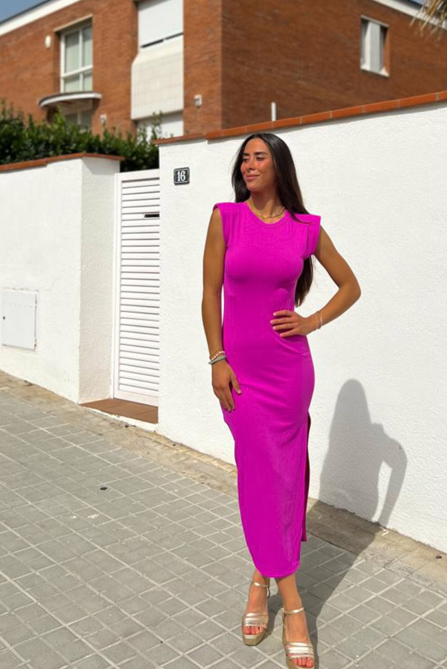 Bodycon magenta basic ελαστικό rib φόρεμα με σκίσιμο στο πλάι. Ένα εφαρμοστό ελαστικό φόρεμα που μπορείς να το φορέσεις από το πρωί έως το βράδυ, ιδανικό για κάθε περίσταση.