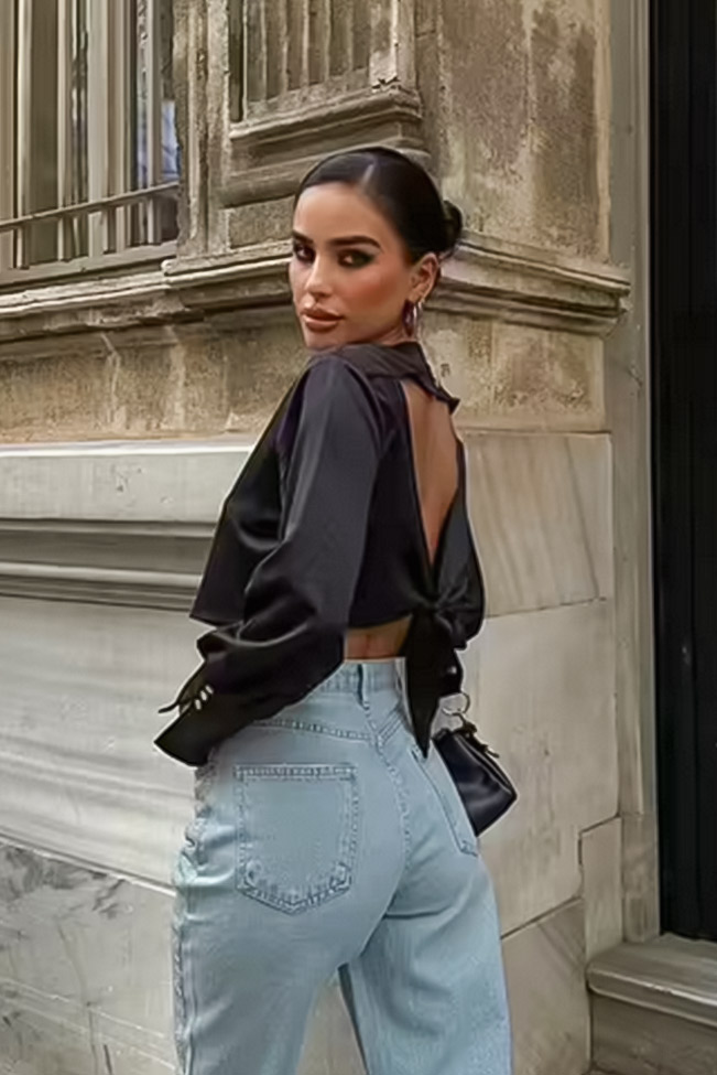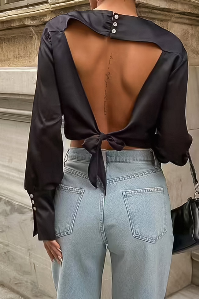 Chic μαύρο μακρυμάνικο μπλουζάκι με ανοιχτή πλάτη, έχει δέσιμο και κούμπωμα πίσω και στα μανίκια. Αυτό το κομψό crop top σε μαύρο χρώμα είναι ιδανικό για κάθε περίσταση, προσφέροντας στυλ και άνεση. Συνδυάζεται τέλεια με τζιν, δημιουργώντας μια μοντέρνα και σέξι εμφάνιση. Οι λεπτομέρειες του σχεδιασμού του αναδεικνύουν τη σιλουέτα, κάνοντάς το απαραίτητο κομμάτι για τη γκαρνταρόμπα σας.