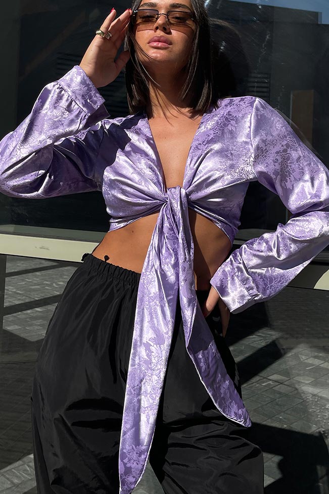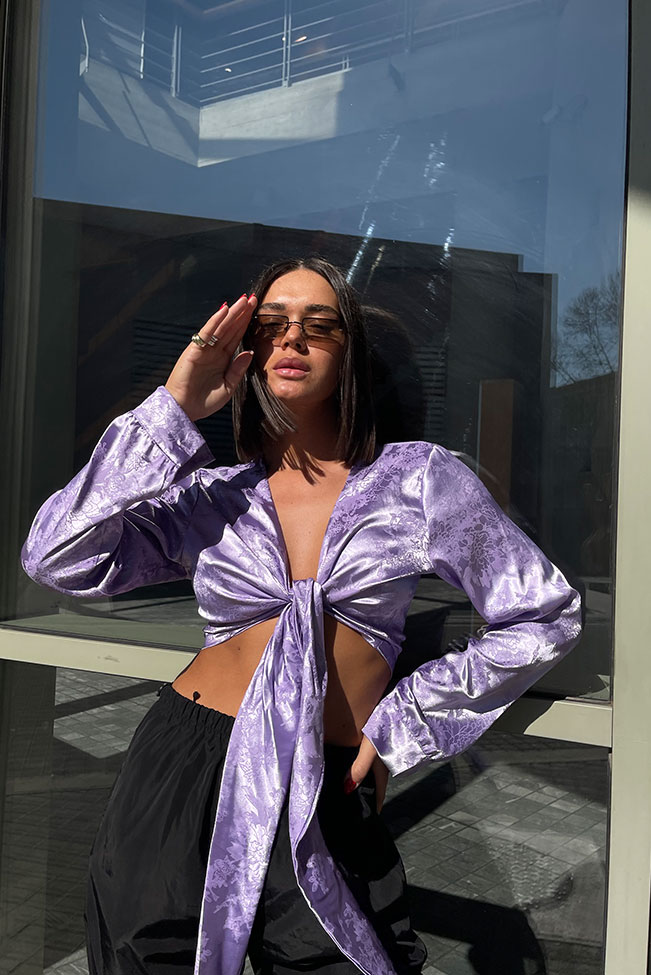 Ένα λιλά σατέν exotic floral δετό τοπ είναι ένα κομψό και μοντέρνο κομμάτι ρούχου που θα αναβαθμίσει την γκαρνταρόμπα σας. Είναι One Size το νουμεράκι του και καλύπτει από Small μέχρι large νουμεράκι.