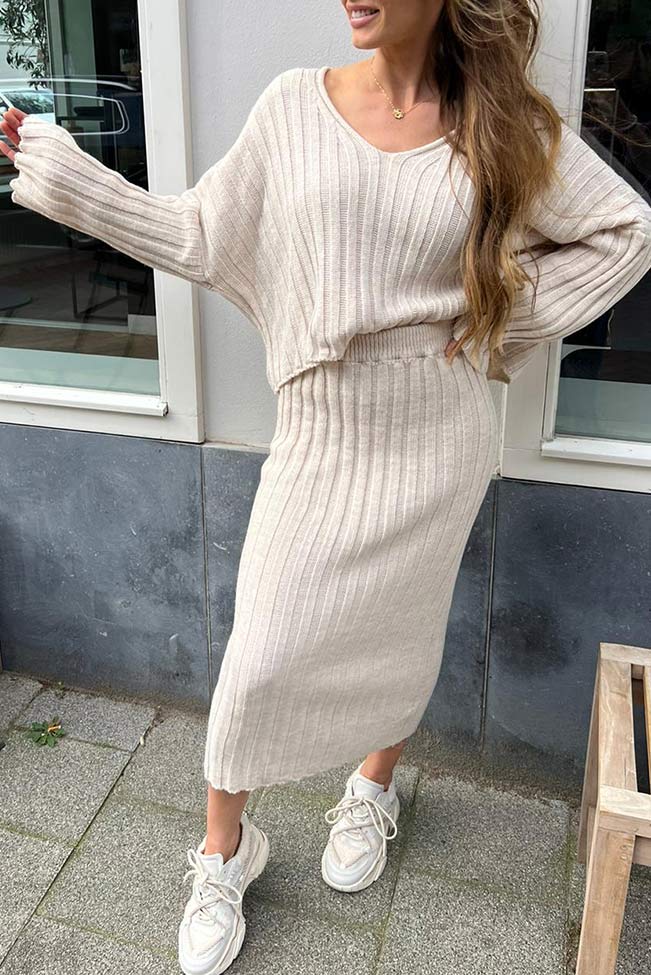 All day άνετο cozy σετάκι σε ανοικτό μπεζ ιβουαρ. Η φούστα έχει μαλακή πλέξη και εφαρμόζει τέλεια στο σώμα, ενώ η μπλούζα προσφέρει άνεση και στυλ. Είναι ιδανικό για καθημερινές εμφανίσεις και μπορεί να συνδυαστεί εύκολα με διάφορα αξεσουάρ για να δημιουργήσετε το δικό σας προσωπικό στυλ.