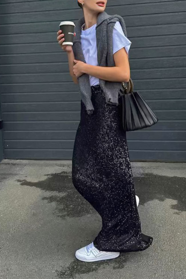 Sequin glam maxi μαύρη φούστα με ελαστικό λάστιχο στην μέση. Διατίθεται σε onesize νουμεράκι.