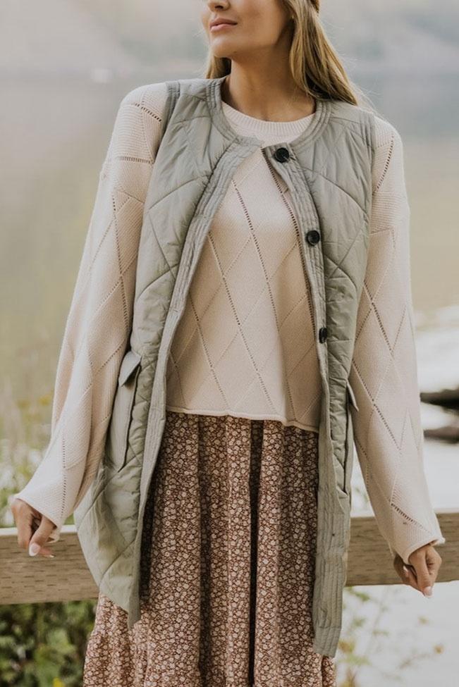 Αμάνικο χακί puffer με τσέπες και κουμπάκια. Αυτό το αμάνικο χακί puffer είναι ένα κομψό και λειτουργικό κομμάτι για την χειμερινή σας γκαρνταρόμπα.