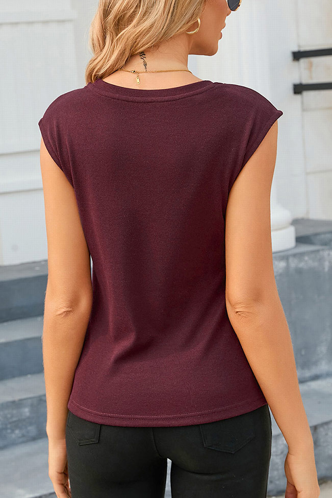 Στυλάτη μπλούζα με στρογγυλή λαιμόκοψη και μοναδική ασύμμετρη κοπή μπροστά σε μπορντό, ιδανική για καθημερινές εξόδους.