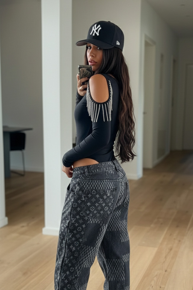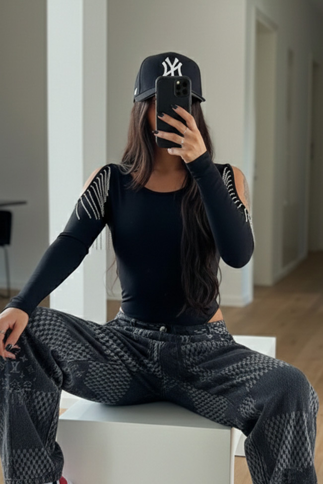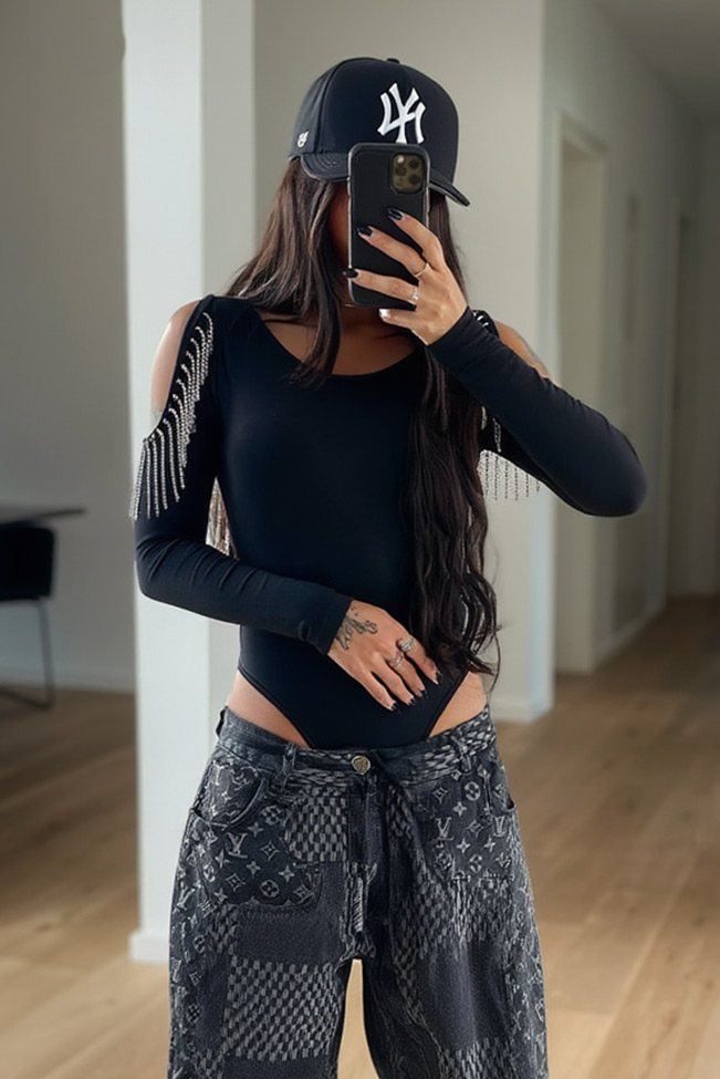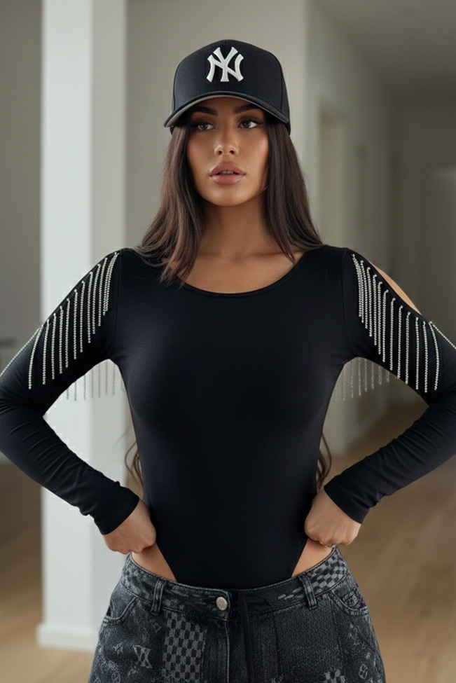 Ολόσωμο μακρυμάνικο κορμάκι με ανοίγματα στους ώμους. Διαθέτει διακοσμητικά στράς κροσάκια και κούμπωμα στο κάτω μέρος.Η εφαρμογη του είναι κανονική και βγαίνει απο small μεχρι Xl.