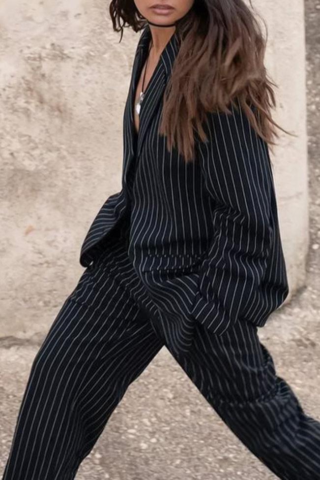 Office loose μαύρο κοστούμι με σακάκι και παντελόνι ριγέ. Το σακάκι έχει διακοσμητικές τσέπες και το παντελόνι είναι σε άνετη γραμμή. Βγαίνει σε onesize νουμεράκι και καλύπτει S, M και L.