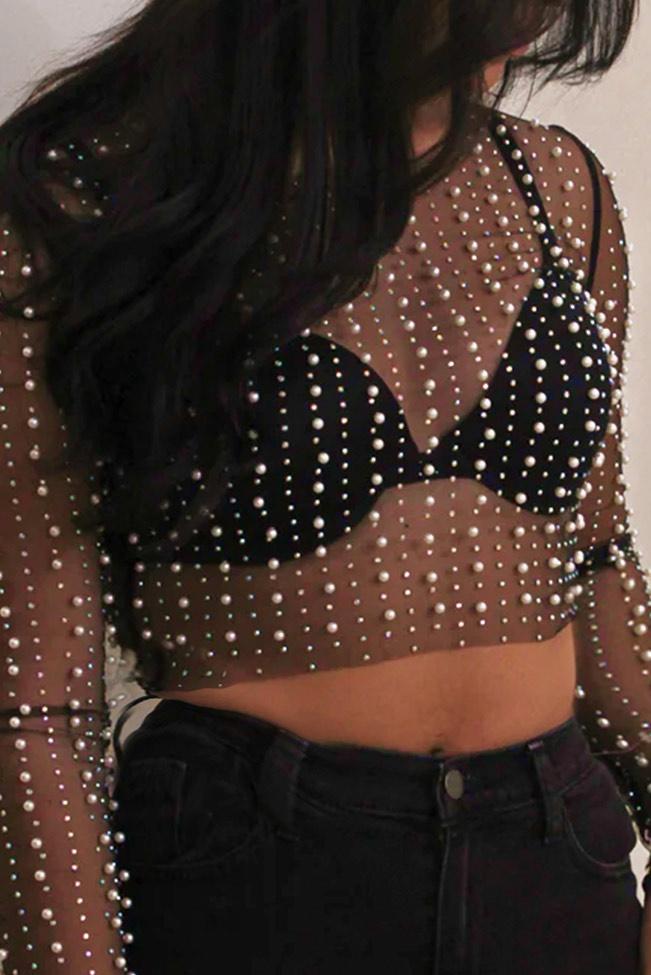 Glam μαύρο μακρυμάνικο τοπάκι τύπου crop, διάφανο με πέρλες και στρας. Διαθέτει μικρή ελαστικότητα και βγαίνει σε νούμερα απο small μέχρι xl και έχει στενή γραμμή.