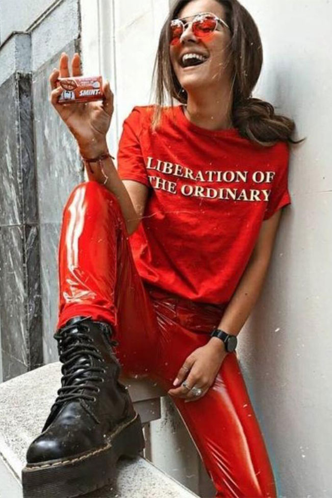 Κόκκινο rock style vinyl κολάν με λάστιχο στην μέση. Είναι ιδανικό για άπειρα βραδινά look και έχει στενή εφαρμοστή γραμμή.