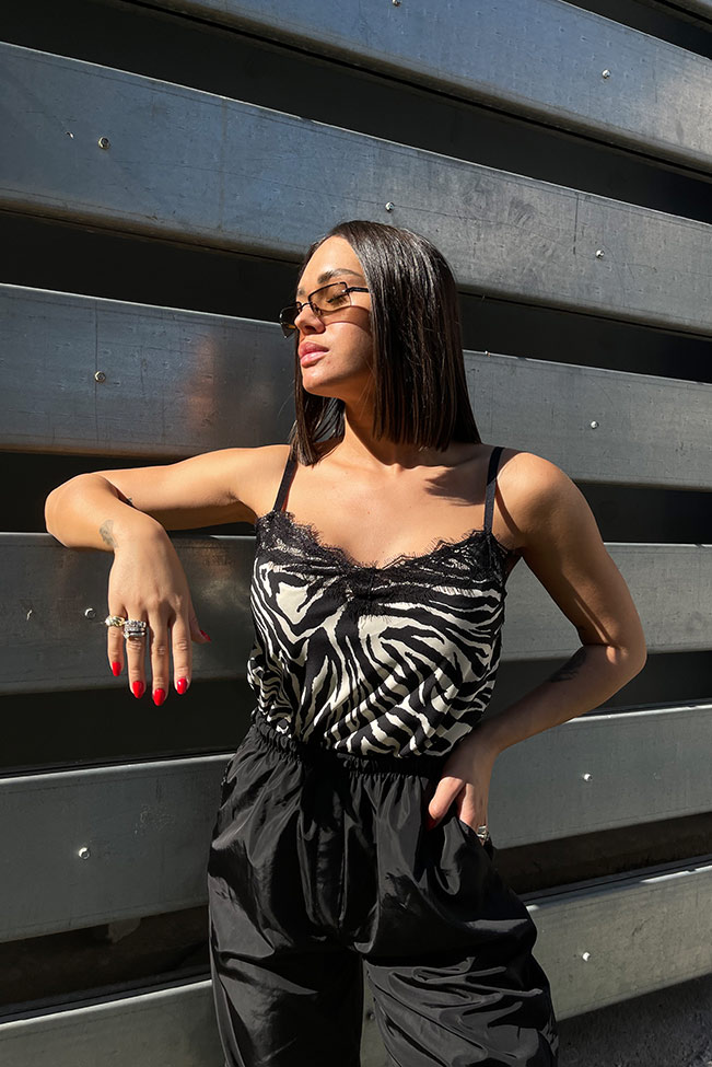 Lingerie τοπ με zebra print και λεπτομέρειες δαντέλας για να το συνδυάσετε με τζίν και φούστες. Είναι One Size το νουμεράκι του και καλύπτει από Small μέχρι large νουμεράκι.