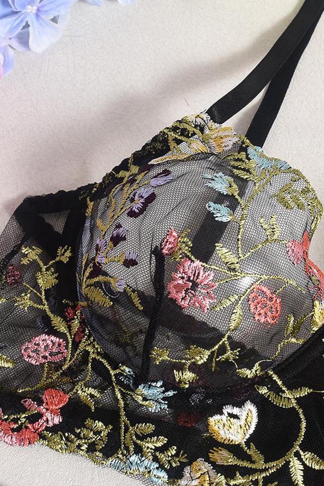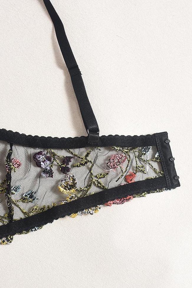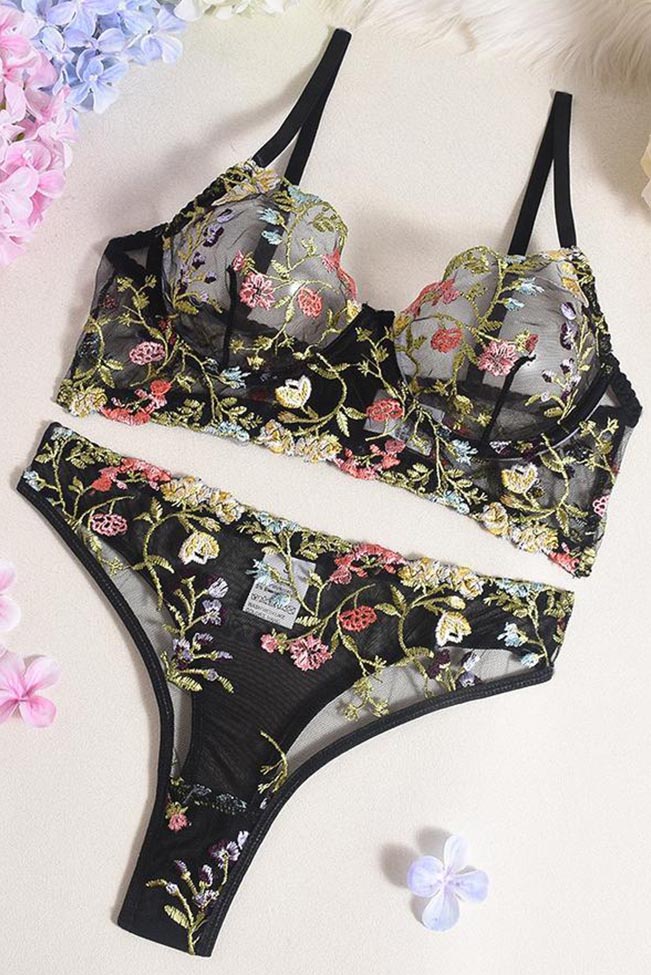 See-through μαύρο σετάκι με bralette σουτιέν και ασορτί thong σλιπ, σε κομψό μαύρο με εντυπωσιακό πολύχρωμο φλοράλ κέντημα.
